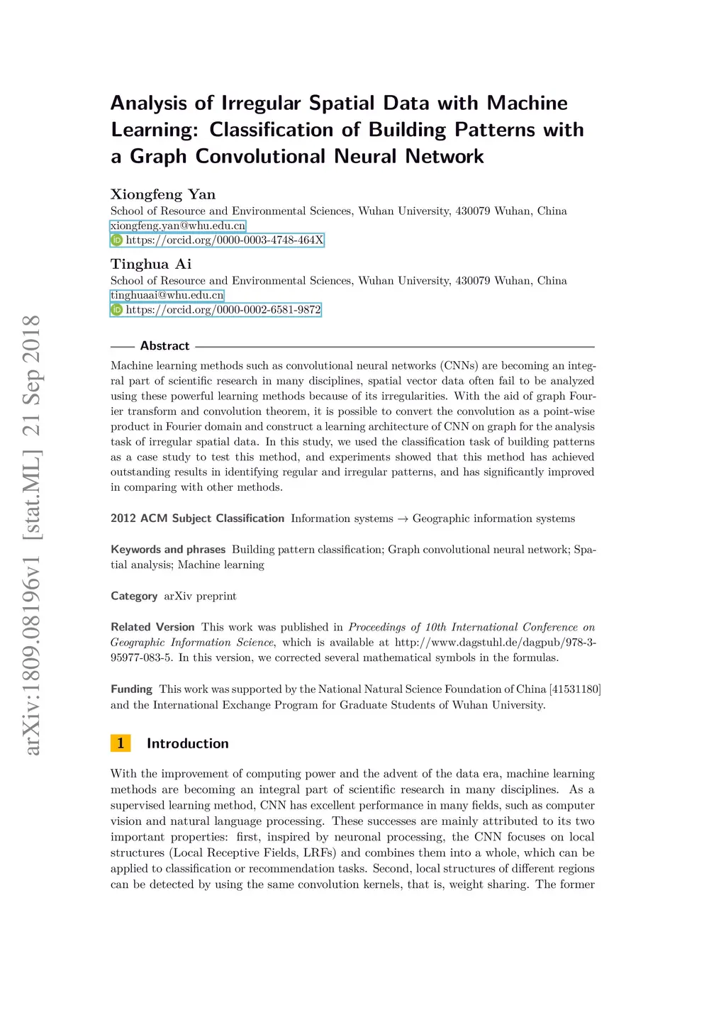 Machine learning methods such as convolutional neural networks (CNNs) are becoming an integral part of scientific research in many disciplines, spatial vector data often fail to be analyzed using these powerful learning methods because of its irregularities. With the aid of graph Fourier transform and convolution theorem, it is possible to convert the convolution as a point-wise product in Fourier domain and construct a learning architecture of CNN on graph for the analysis task of irregular spatial data. In this study, we used the classification task of building patterns as a case study to test this method, and experiments showed that this method has achieved outstanding results in identifying regular and irregular patterns, and has significantly improved in comparing with other methods.
