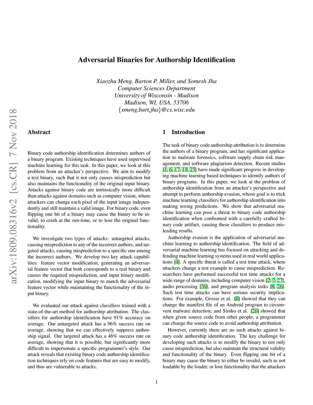Adversarial Binaries for Authorship Identification