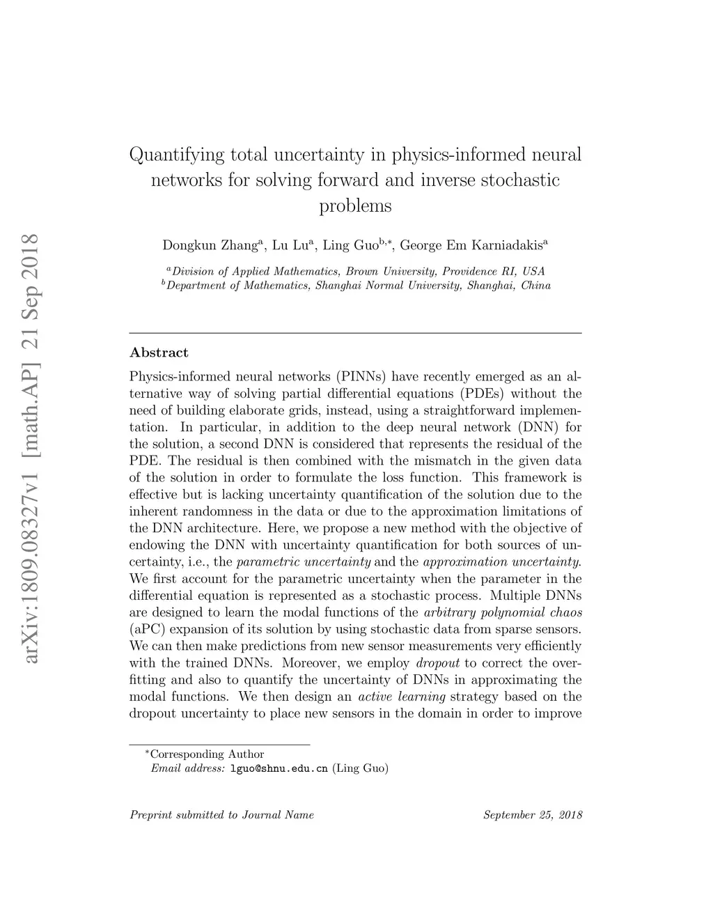 Physics-informed neural networks (PINNs) have recently emerged as an alternative way of solving partial differential equations (PDEs) without the need of building elaborate grids, instead, using a straightforward implementation. In particular, in addition to the deep neural network (DNN) for the solution, a second DNN is considered that represents the residual of the PDE. The residual is then combined with the mismatch in the given data of the solution in order to formulate the loss function. This framework is effective but is lacking uncertainty quantification of the solution due to the inherent randomness in the data or due to the approximation limitations of the DNN architecture. Here, we propose a new method with the objective of endowing the DNN with uncertainty quantification for both sources of uncertainty, i.e., the parametric uncertainty and the approximation uncertainty. We first account for the parametric uncertainty when the parameter in the differential equation is represented as a stochastic process. Multiple DNNs are designed to learn the modal functions of the arbitrary polynomial chaos (aPC) expansion of its solution by using stochastic data from sparse sensors. We can then make predictions from new sensor measurements very efficiently with the trained DNNs. Moreover, we employ dropout to correct the over-fitting and also to quantify the uncertainty of DNNs in approximating the modal functions. We then design an active learning strategy based on the dropout uncertainty to place new sensors in the domain to improve the predictions of DNNs. Several numerical tests are conducted for both the forward and the inverse problems to quantify the effectiveness of PINNs combined with uncertainty quantification. This NN-aPC new paradigm of physics-informed deep learning with uncertainty quantification can be readily applied to other types of stochastic PDEs in multi-dimensions.