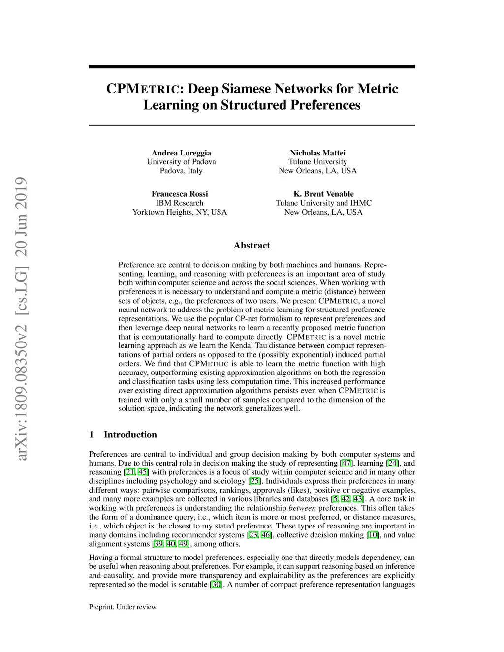Preference are central to decision making by both machines and humans. Representing, learning, and reasoning with preferences is an important area of study both within computer science and across the sciences. When working with preferences it is necessary to understand and compute the distance between sets of objects, e.g., the preferences of a user and a the descriptions of objects to be recommended. We present CPDist, a novel neural network to address the problem of learning to measure the distance between structured preference representations. We use the popular CP-net formalism to represent preferences and then leverage deep neural networks to learn a recently proposed metric function that is computationally hard to compute directly. CPDist is a novel metric learning approach based on the use of deep siamese networks which learn the Kendal Tau distance between partial orders that are induced by compact preference representations. We find that CPDist is able to learn the distance function with high accuracy and outperform existing approximation algorithms on both the regression and classification task using less computation time. Performance remains good even when CPDist is trained with only a small number of samples compared to the dimension of the solution space, indicating the network generalizes well.