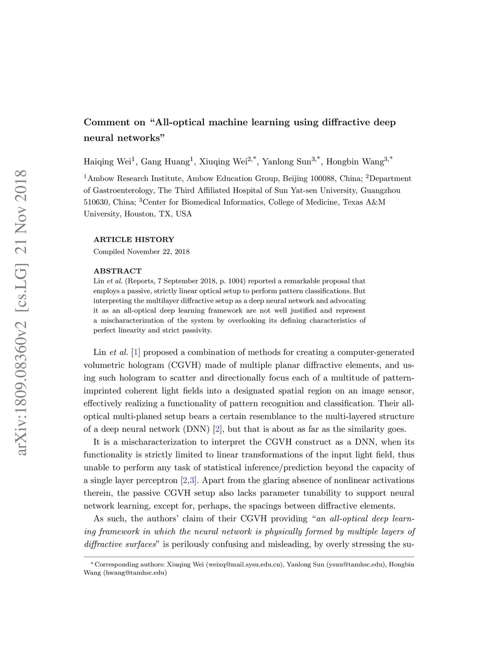 Lin et al. (Reports, 7 September 2018, p. 1004) reported a remarkable proposal that employs a passive, strictly linear optical setup to perform pattern classifications. But interpreting the multilayer diffractive setup as a deep neural network and advocating it as an all-optical deep learning framework are not well justified and represent a mischaracterization of the system by overlooking its defining characteristics of perfect linearity and strict passivity.