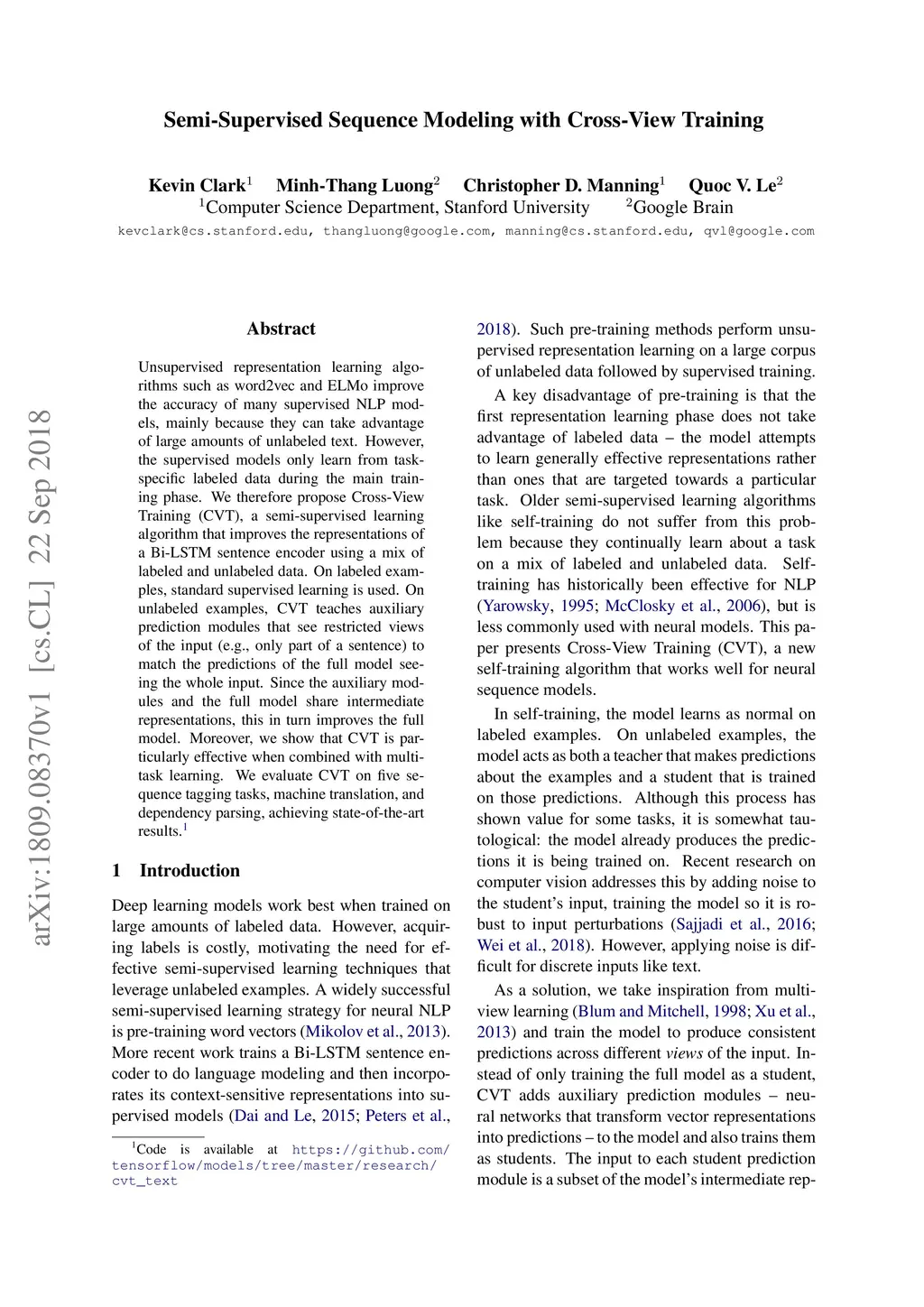 Semi-Supervised Sequence Modeling with Cross-View Training