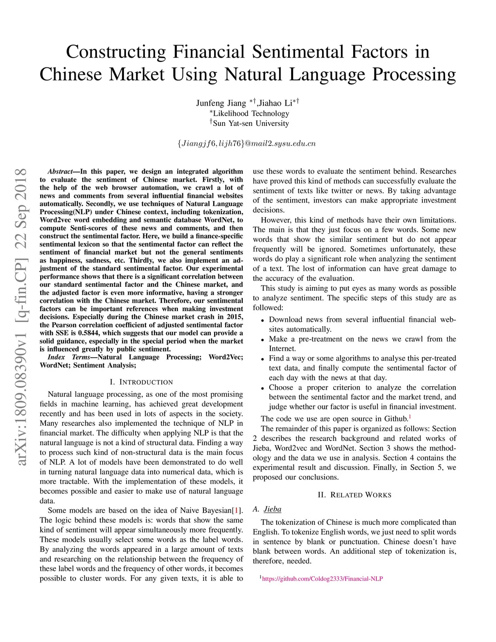 In this paper, we design an integrated algorithm to evaluate the sentiment of Chinese market. Firstly, with the help of the web browser automation, we crawl a lot of news and comments from several influential financial websites automatically. Secondly, we use techniques of Natural Language Processing(NLP) under Chinese context, including tokenization, Word2vec word embedding and semantic database WordNet, to compute Senti-scores of these news and comments, and then construct the sentimental factor. Here, we build a finance-specific sentimental lexicon so that the sentimental factor can reflect the sentiment of financial market but not the general sentiments as happiness, sadness, etc. Thirdly, we also implement an adjustment of the standard sentimental factor. Our experimental performance shows that there is a significant correlation between our standard sentimental factor and the Chinese market, and the adjusted factor is even more informative, having a stronger correlation with the Chinese market. Therefore, our sentimental factors can be important references when making investment decisions. Especially during the Chinese market crash in 2015, the Pearson correlation coefficient of adjusted sentimental factor with SSE is 0.5844, which suggests that our model can provide a solid guidance, especially in the special period when the market is influenced greatly by public sentiment.