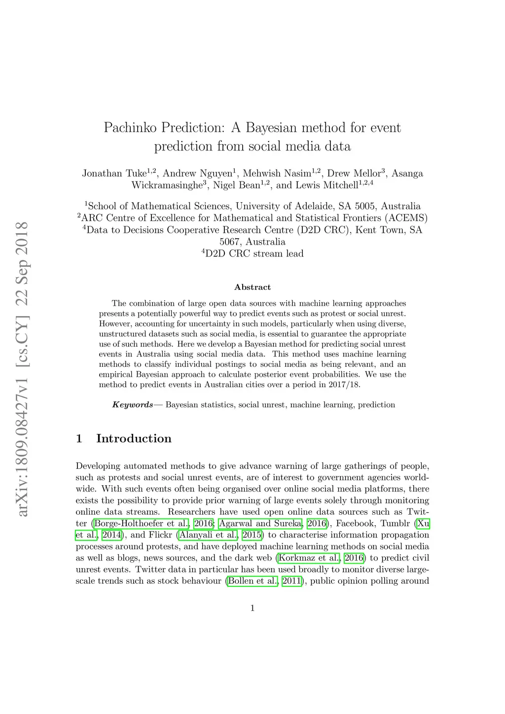 The combination of large open data sources with machine learning approaches presents a potentially powerful way to predict events such as protest or social unrest. However, accounting for uncertainty in such models, particularly when using diverse, unstructured datasets such as social media, is essential to guarantee the appropriate use of such methods. Here we develop a Bayesian method for predicting social unrest events in Australia using social media data. This method uses machine learning methods to classify individual postings to social media as being relevant, and an empirical Bayesian approach to calculate posterior event probabilities. We use the method to predict events in Australian cities over a period in 2017/18.