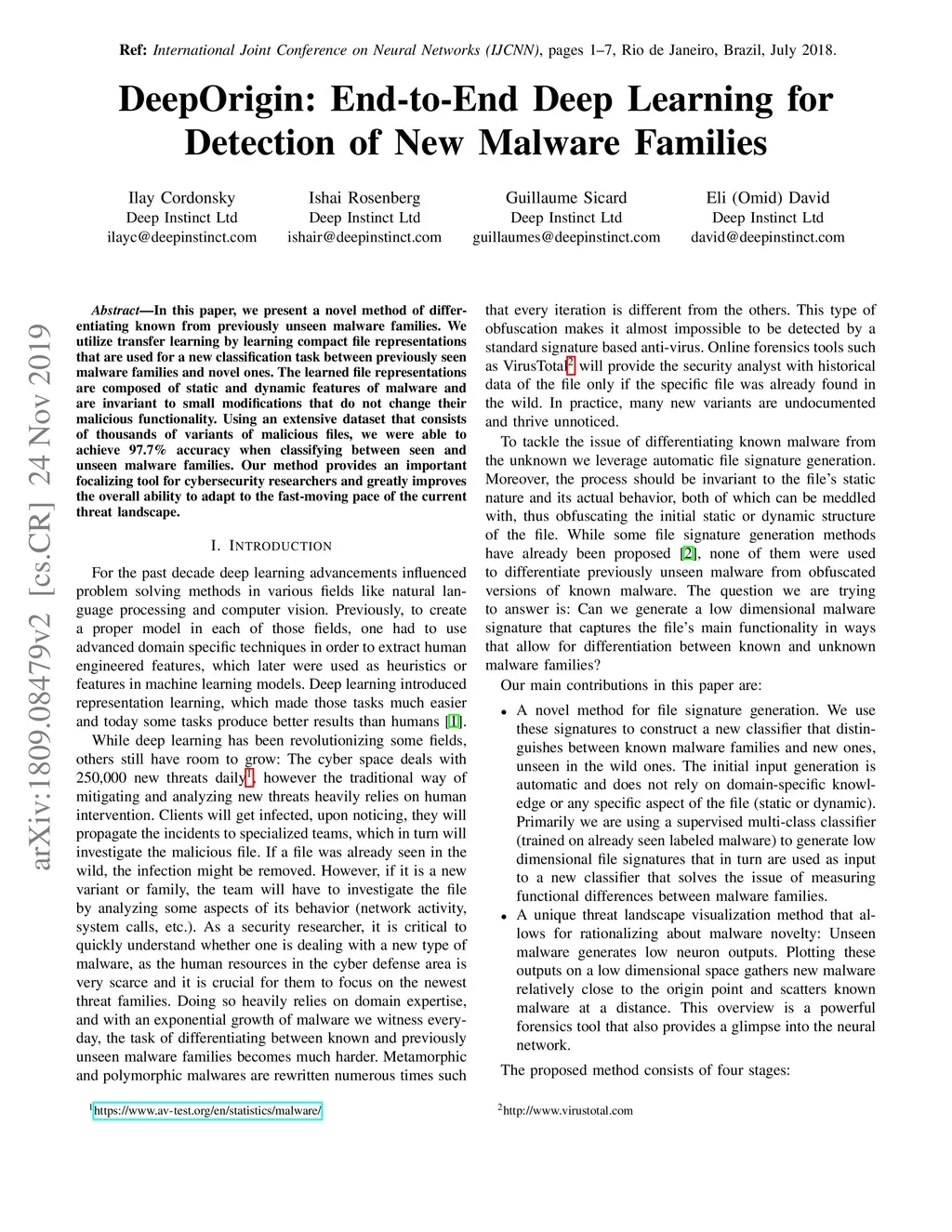 DeepOrigin: End-to-End Deep Learning for Detection of New Malware