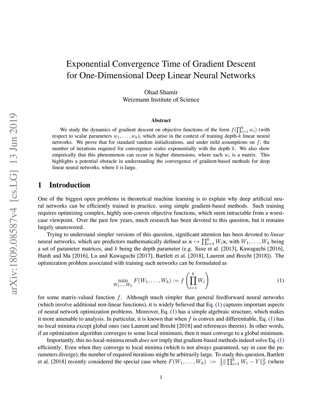 We study the dynamics of gradient descent on objective functions of the form (with respect to scalar parameters ), which arise in the context of training depth- linear neural networks. We prove that for standard random initializations, and under mild assumptions on , the number of iterations required for convergence scales exponentially with the depth . We also show empirically that this phenomenon can occur in higher dimensions, where each is a matrix. This highlights a potential obstacle in understanding the convergence of gradient-based methods for deep linear neural networks, where is large.