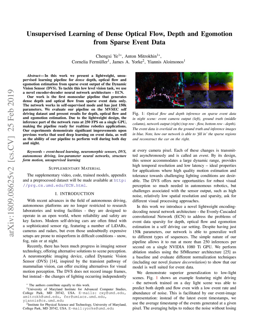 In this work we present a lightweight, unsupervised learning pipeline for \textit{dense} depth, optical flow and egomotion estimation from sparse event output of the Dynamic Vision Sensor (DVS). To tackle this low level vision task, we use a novel encoder-decoder neural network architecture - ECN. Our work is the first monocular pipeline that generates dense depth and optical flow from sparse event data only. The network works in self-supervised mode and has just 150k parameters. We evaluate our pipeline on the MVSEC self driving dataset and present results for depth, optical flow and and egomotion estimation. Due to the lightweight design, the inference part of the network runs at 250 FPS on a single GPU, making the pipeline ready for realtime robotics applications. Our experiments demonstrate significant improvements upon previous works that used deep learning on event data, as well as the ability of our pipeline to perform well during both day and night.