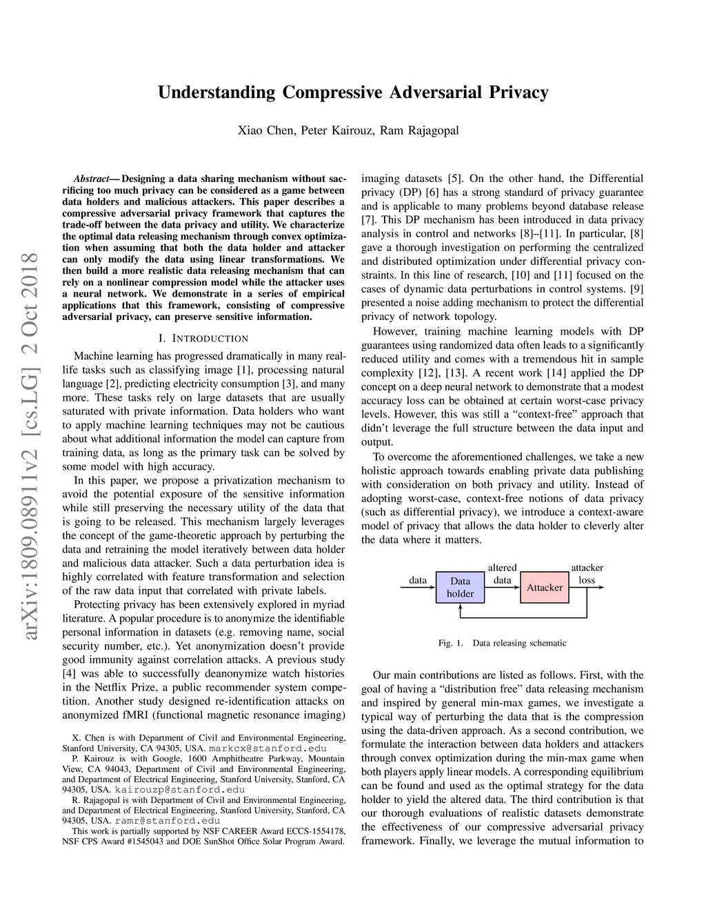 Designing a data sharing mechanism without sacrificing too much privacy can be considered as a game between data holders and malicious attackers. This paper describes a compressive adversarial privacy framework that captures the trade-off between the data privacy and utility. We characterize the optimal data releasing mechanism through convex optimization when assuming that both the data holder and attacker can only modify the data using linear transformations. We then build a more realistic data releasing mechanism that can rely on a nonlinear compression model while the attacker uses a neural network. We demonstrate in a series of empirical applications that this framework, consisting of compressive adversarial privacy, can preserve sensitive information.
