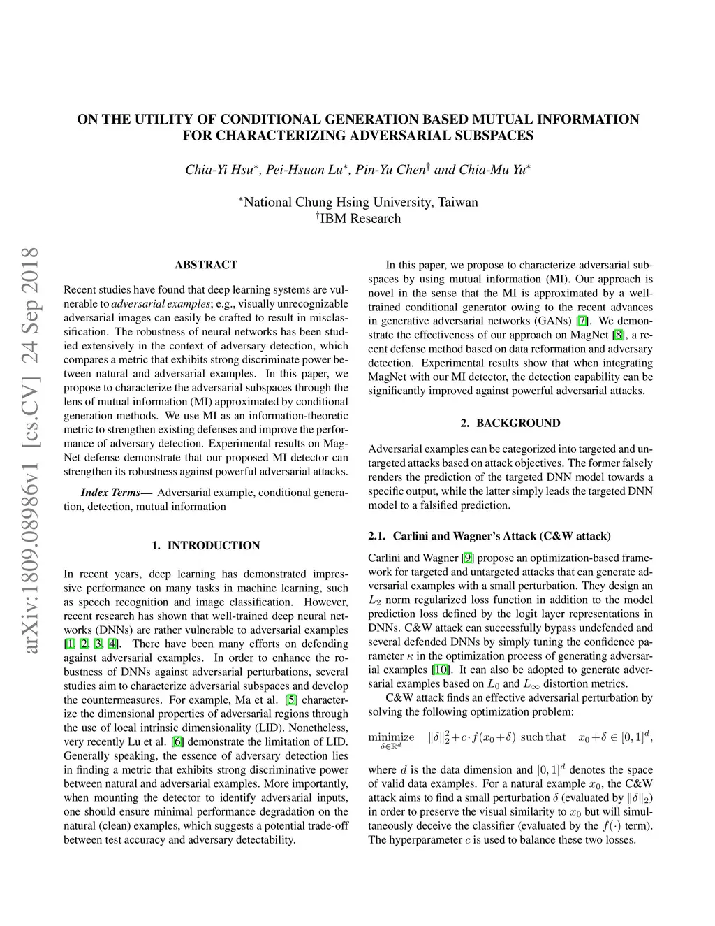 Recent studies have found that deep learning systems are vulnerable to adversarial examples; e.g., visually unrecognizable adversarial images can easily be crafted to result in misclassification. The robustness of neural networks has been studied extensively in the context of adversary detection, which compares a metric that exhibits strong discriminate power between natural and adversarial examples. In this paper, we propose to characterize the adversarial subspaces through the lens of mutual information (MI) approximated by conditional generation methods. We use MI as an information-theoretic metric to strengthen existing defenses and improve the performance of adversary detection. Experimental results on MagNet defense demonstrate that our proposed MI detector can strengthen its robustness against powerful adversarial attacks.