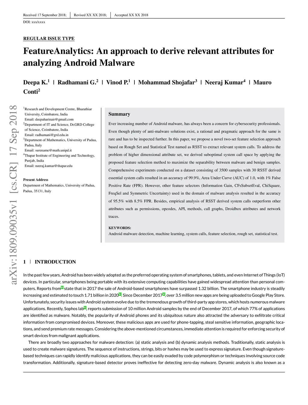Ever increasing number of Android malware, has always been a concern for cybersecurity professionals. Even though plenty of anti-malware solutions exist, a rational and pragmatic approach for the same is rare and has to be inspected further. In this paper, we propose a novel two-set feature selection approach based on Rough Set and Statistical Test named as RSST to extract relevant system calls. To address the problem of higher dimensional attribute set, we derived suboptimal system call space by applying the proposed feature selection method to maximize the separability between malware and benign samples. Comprehensive experiments conducted on a dataset consisting of 3500 samples with 30 RSST derived essential system calls resulted in an accuracy of 99.9%, Area Under Curve (AUC) of 1.0, with 1% False Positive Rate (FPR). However, other feature selectors (Information Gain, CFsSubsetEval, ChiSquare, FreqSel and Symmetric Uncertainty) used in the domain of malware analysis resulted in the accuracy of 95.5% with 8.5% FPR. Besides, empirical analysis of RSST derived system calls outperform other attributes such as permissions, opcodes, API, methods, call graphs, Droidbox attributes and network traces.