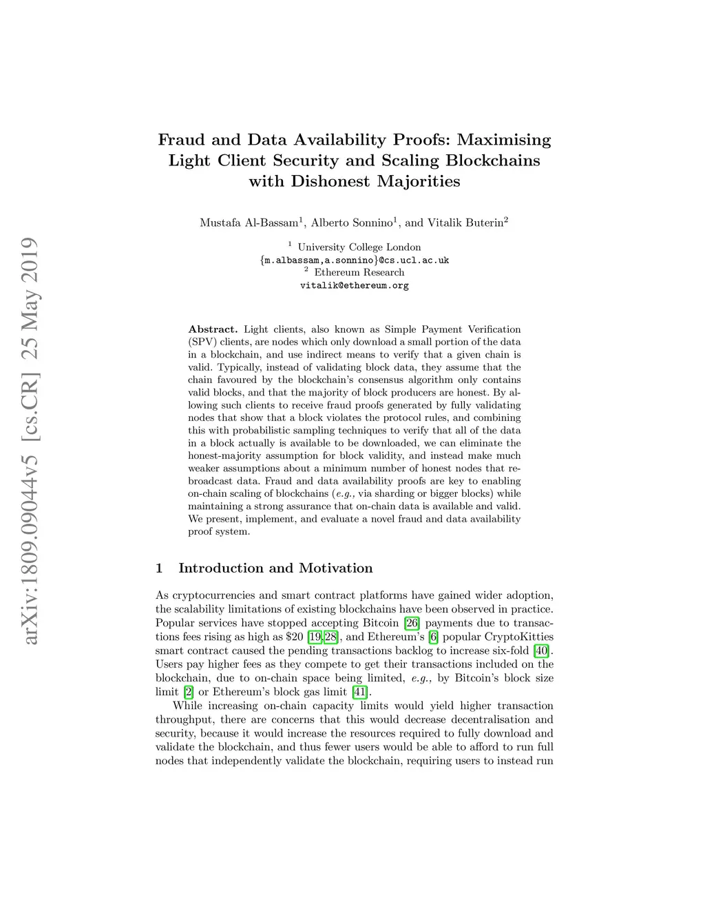 Light clients, also known as Simple Payment Verification (SPV) clients, are nodes which only download a small portion of the data in a blockchain, and use indirect means to verify that a given chain is valid. Typically, instead of validating block data, they assume that the chain favoured by the blockchain's consensus algorithm only contains valid blocks, and that the majority of block producers are honest. By allowing such clients to receive fraud proofs generated by fully validating nodes that show that a block violates the protocol rules, and combining this with probabilistic sampling techniques to verify that all of the data in a block actually is available to be downloaded, we can eliminate the honest-majority assumption, and instead make much weaker assumptions about a minimum number of honest nodes that rebroadcast data. Fraud and data availability proofs are key to enabling on-chain scaling of blockchains (e.g. via sharding or bigger blocks) while maintaining a strong assurance that on-chain data is available and valid. We present, implement, and evaluate a novel fraud and data availability proof system.