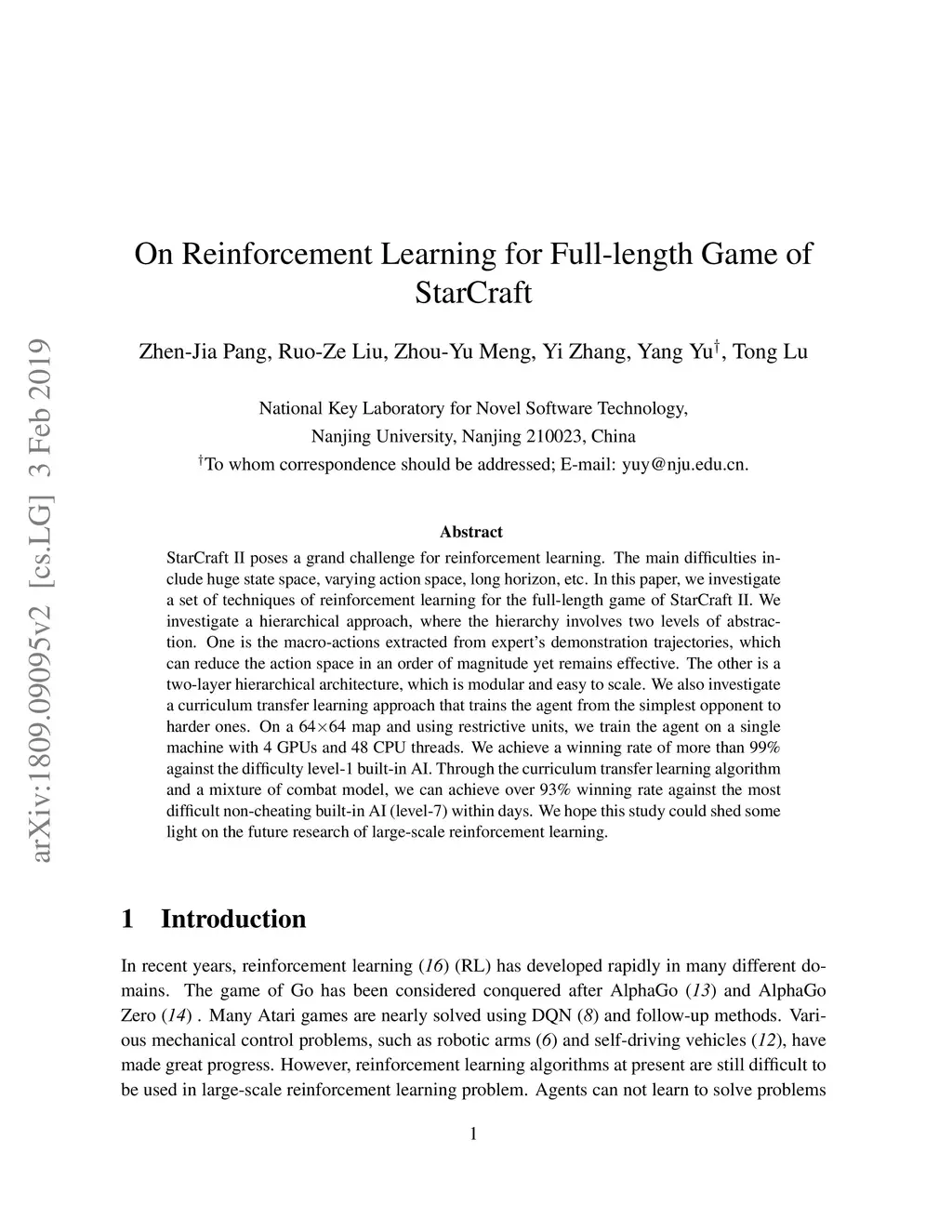 StarCraft II poses a grand challenge for reinforcement learning. The main difficulties of it include huge state and action space and a long-time horizon. In this paper, we investigate a hierarchical reinforcement learning approach for StarCraft II. The hierarchy involves two levels of abstraction. One is the macro-action automatically extracted from expert's trajectories, which reduces the action space in an order of magnitude yet remains effective. The other is a two-layer hierarchical architecture which is modular and easy to scale, enabling a curriculum transferring from simpler tasks to more complex tasks. The reinforcement training algorithm for this architecture is also investigated. On a 64x64 map and using restrictive units, we achieve a winning rate of more than 99\% against the difficulty level-1 built-in AI. Through the curriculum transfer learning algorithm and a mixture of combat model, we can achieve over 93\% winning rate of Protoss against the most difficult non-cheating built-in AI (level-7) of Terran, training within two days using a single machine with only 48 CPU cores and 8 K40 GPUs. It also shows strong generalization performance, when tested against never seen opponents including cheating levels built-in AI and all levels of Zerg and Protoss built-in AI. We hope this study could shed some light on the future research of large-scale reinforcement learning.