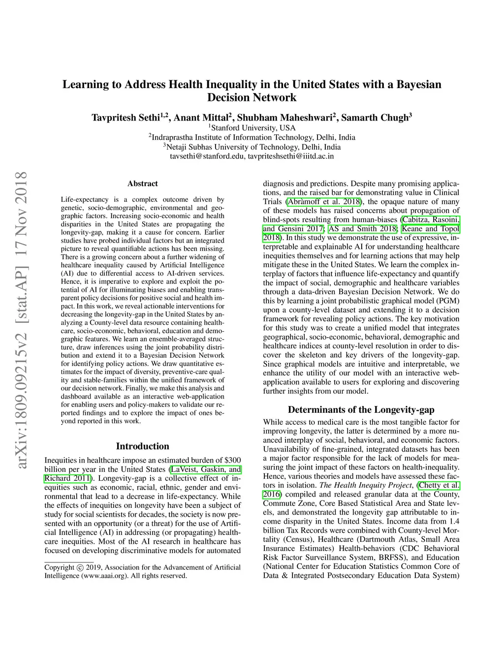 Life-expectancy is a complex outcome driven by genetic, socio-demographic, environmental and geographic factors. Increasing socio-economic and health disparities in the United States are propagating the longevity-gap, making it a cause for concern. Earlier studies have probed individual factors but an integrated picture to reveal quantifiable actions has been missing. There is a growing concern about a further widening of healthcare inequality caused by Artificial Intelligence (AI) due to differential access to AI-driven services. Hence, it is imperative to explore and exploit the potential of AI for illuminating biases and enabling transparent policy decisions for positive social and health impact. In this work, we reveal actionable interventions for decreasing the longevity-gap in the United States by analyzing a County-level data resource containing healthcare, socio-economic, behavioral, education and demographic features. We learn an ensemble-averaged structure, draw inferences using the joint probability distribution and extend it to a Bayesian Decision Network for identifying policy actions. We draw quantitative estimates for the impact of diversity, preventive-care quality and stable-families within the unified framework of our decision network. Finally, we make this analysis and dashboard available as an interactive web-application for enabling users and policy-makers to validate our reported findings and to explore the impact of ones beyond reported in this work.