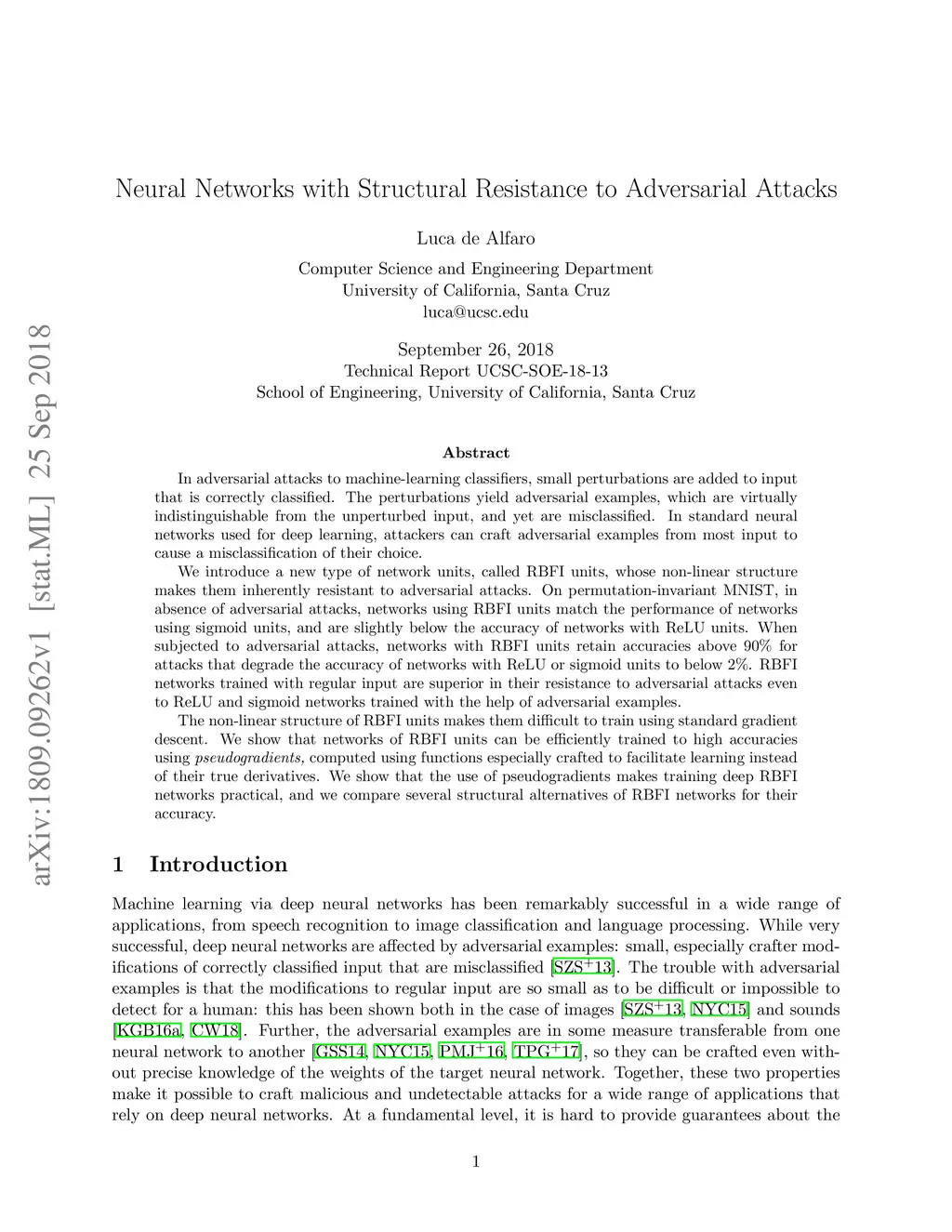 In adversarial attacks to machine-learning classifiers, small perturbations are added to input that is correctly classified. The perturbations yield adversarial examples, which are virtually indistinguishable from the unperturbed input, and yet are misclassified. In standard neural networks used for deep learning, attackers can craft adversarial examples from most input to cause a misclassification of their choice. We introduce a new type of network units, called RBFI units, whose non-linear structure makes them inherently resistant to adversarial attacks. On permutation-invariant MNIST, in absence of adversarial attacks, networks using RBFI units match the performance of networks using sigmoid units, and are slightly below the accuracy of networks with ReLU units. When subjected to adversarial attacks, networks with RBFI units retain accuracies above 90% for attacks that degrade the accuracy of networks with ReLU or sigmoid units to below 2%. RBFI networks trained with regular input are superior in their resistance to adversarial attacks even to ReLU and sigmoid networks trained with the help of adversarial examples. The non-linear structure of RBFI units makes them difficult to train using standard gradient descent. We show that networks of RBFI units can be efficiently trained to high accuracies using pseudogradients, computed using functions especially crafted to facilitate learning instead of their true derivatives. We show that the use of pseudogradients makes training deep RBFI networks practical, and we compare several structural alternatives of RBFI networks for their accuracy.