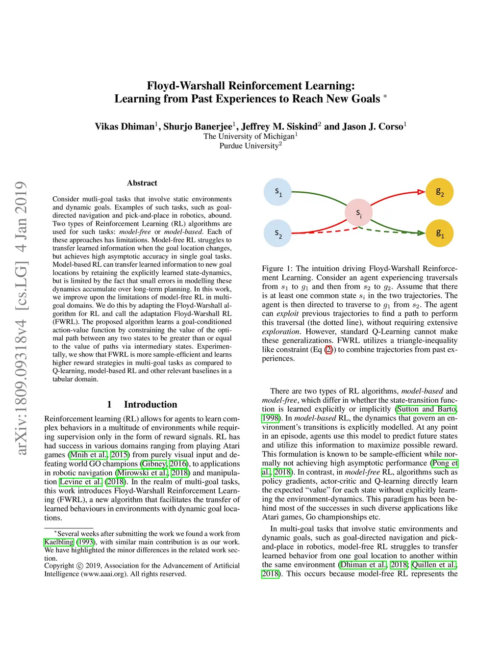 Consider mutli-goal tasks that involve static environments and dynamic goals. Examples of such tasks, such as goal-directed navigation and pick-and-place in robotics, abound. Two types of Reinforcement Learning (RL) algorithms are used for such tasks: model-free or model-based. Each of these approaches has limitations. Model-free RL struggles to transfer learned information when the goal location changes, but achieves high asymptotic accuracy in single goal tasks. Model-based RL can transfer learned information to new goal locations by retaining the explicitly learned state-dynamics, but is limited by the fact that small errors in modelling these dynamics accumulate over long-term planning. In this work, we improve upon the limitations of model-free RL in multi-goal domains. We do this by adapting the Floyd-Warshall algorithm for RL and call the adaptation Floyd-Warshall RL (FWRL). The proposed algorithm learns a goal-conditioned action-value function by constraining the value of the optimal path between any two states to be greater than or equal to the value of paths via intermediary states. Experimentally, we show that FWRL is more sample-efficient and learns higher reward strategies in multi-goal tasks as compared to Q-learning, model-based RL and other relevant baselines in a tabular domain.