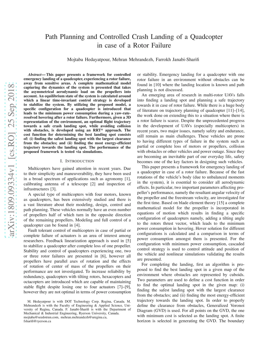 Path Planning and Controlled Crash Landing of a Quadcopter in case of a