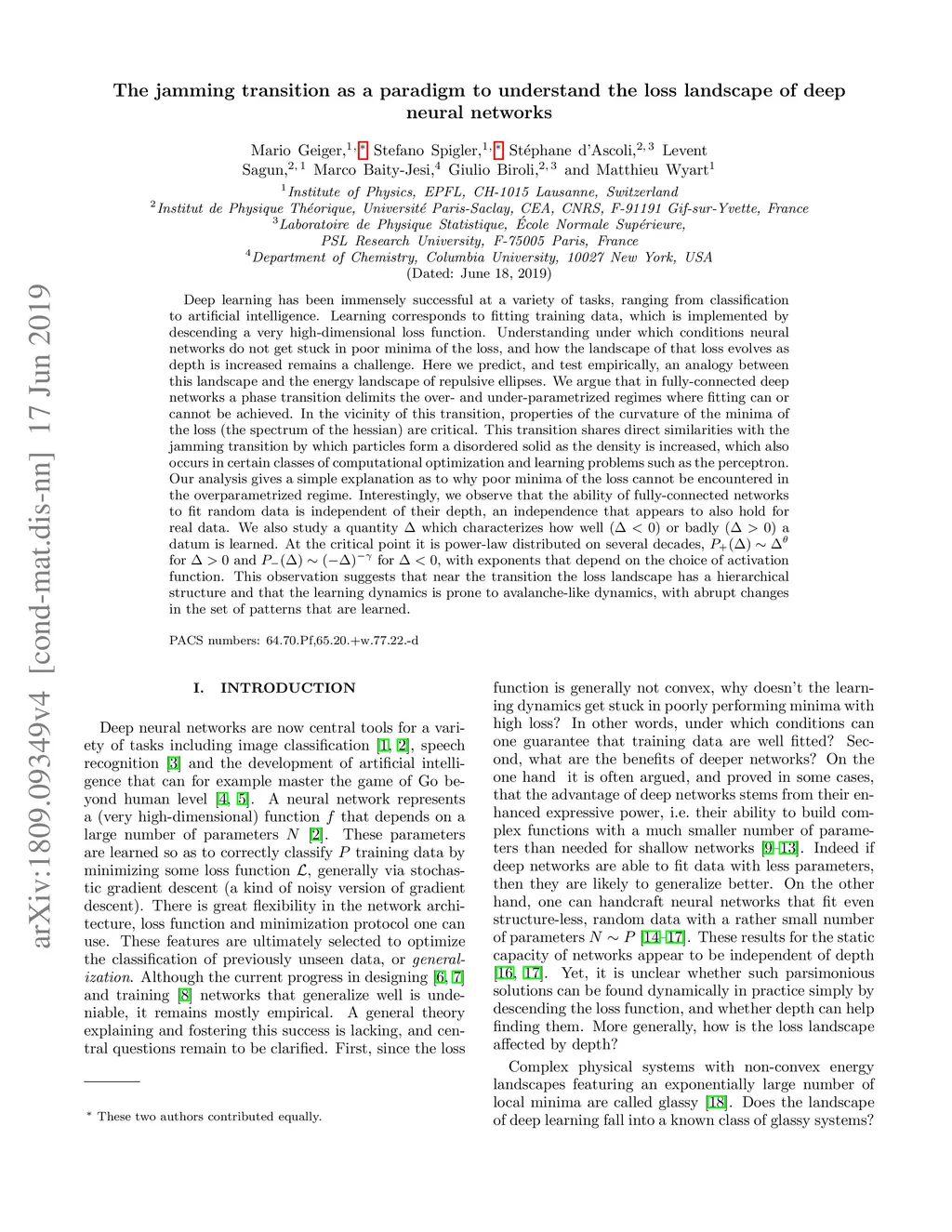 Deep learning has been immensely successful at a variety of tasks, ranging from classification to AI. Learning corresponds to fitting training data, which is implemented by descending a very high-dimensional loss function. Understanding under which conditions neural networks do not get stuck in poor minima of the loss, and how the landscape of that loss evolves as depth is increased remains a challenge. Here we predict, and test empirically, an analogy between this landscape and the energy landscape of repulsive ellipses. We argue that in FC networks a phase transition delimits the over- and under-parametrized regimes where fitting can or cannot be achieved. In the vicinity of this transition, properties of the curvature of the minima of the loss are critical. This transition shares direct similarities with the jamming transition by which particles form a disordered solid as the density is increased, which also occurs in certain classes of computational optimization and learning problems such as the perceptron. Our analysis gives a simple explanation as to why poor minima of the loss cannot be encountered in the overparametrized regime, and puts forward the surprising result that the ability of fully connected networks to fit random data is independent of their depth. Our observations suggests that this independence also holds for real data. We also study a quantity which characterizes how well () or badly () a datum is learned. At the critical point it is power-law distributed, for and for , with and . This observation suggests that near the transition the loss landscape has a hierarchical structure and that the learning dynamics is prone to avalanche-like dynamics, with abrupt changes in the set of patterns that are learned.