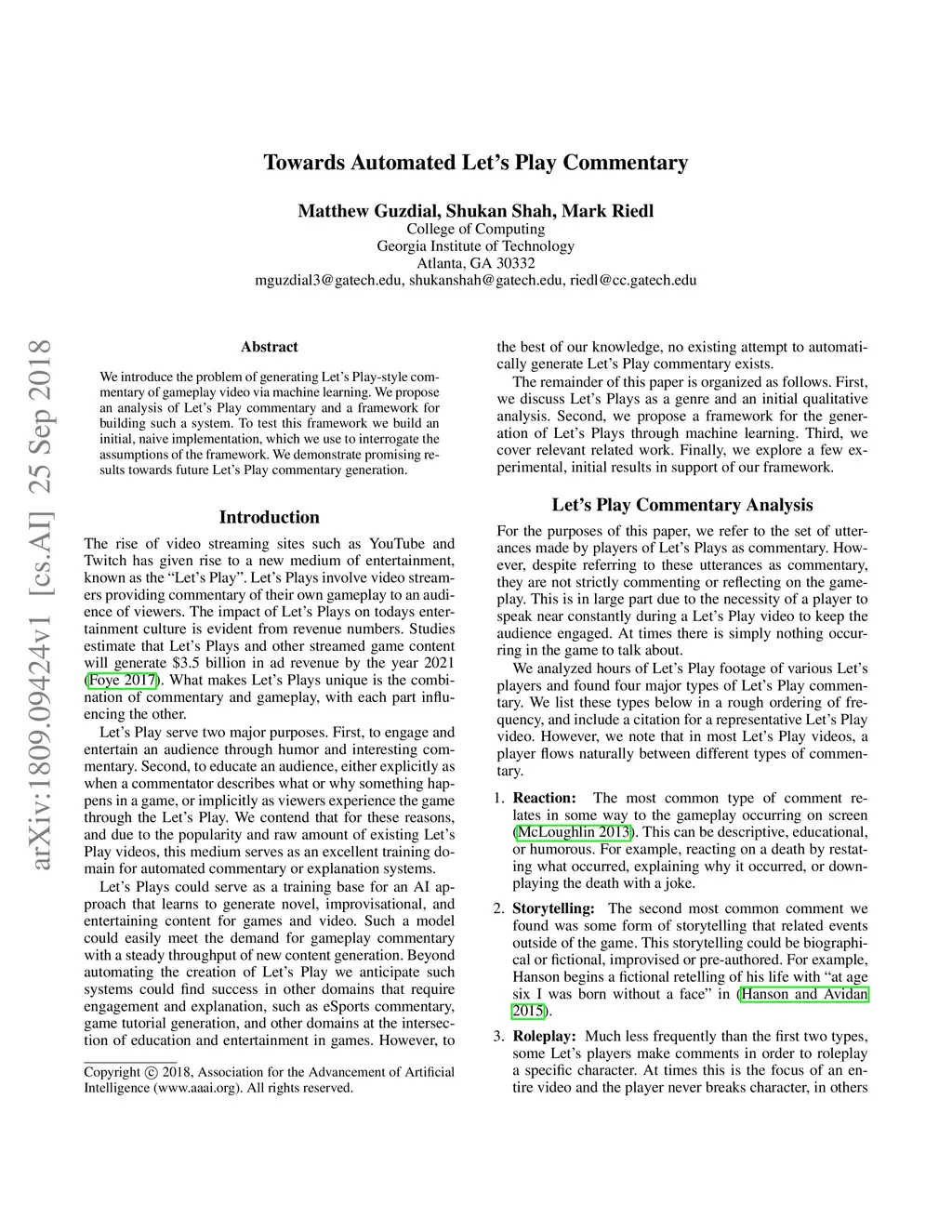 Towards Automated Let's Play Commentary