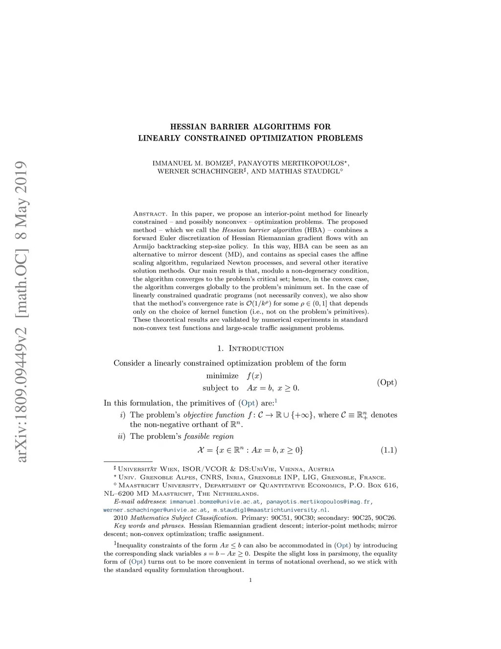 In this paper, we propose an interior-point method for linearly constrained optimization problems (possibly nonconvex). The method - which we call the Hessian barrier algorithm (HBA) - combines a forward Euler discretization of Hessian Riemannian gradient flows with an Armijo backtracking step-size policy. In this way, HBA can be seen as an alternative to mirror descent (MD), and contains as special cases the affine scaling algorithm, regularized Newton processes, and several other iterative solution methods. Our main result is that, modulo a non-degeneracy condition, the algorithm converges to the problem's set of critical points; hence, in the convex case, the algorithm converges globally to the problem's minimum set. In the case of linearly constrained quadratic programs (not necessarily convex), we also show that the method's convergence rate is for some that depends only on the choice of kernel function (i.e., not on the problem's primitives). These theoretical results are validated by numerical experiments in standard non-convex test functions and large-scale traffic assignment problems.