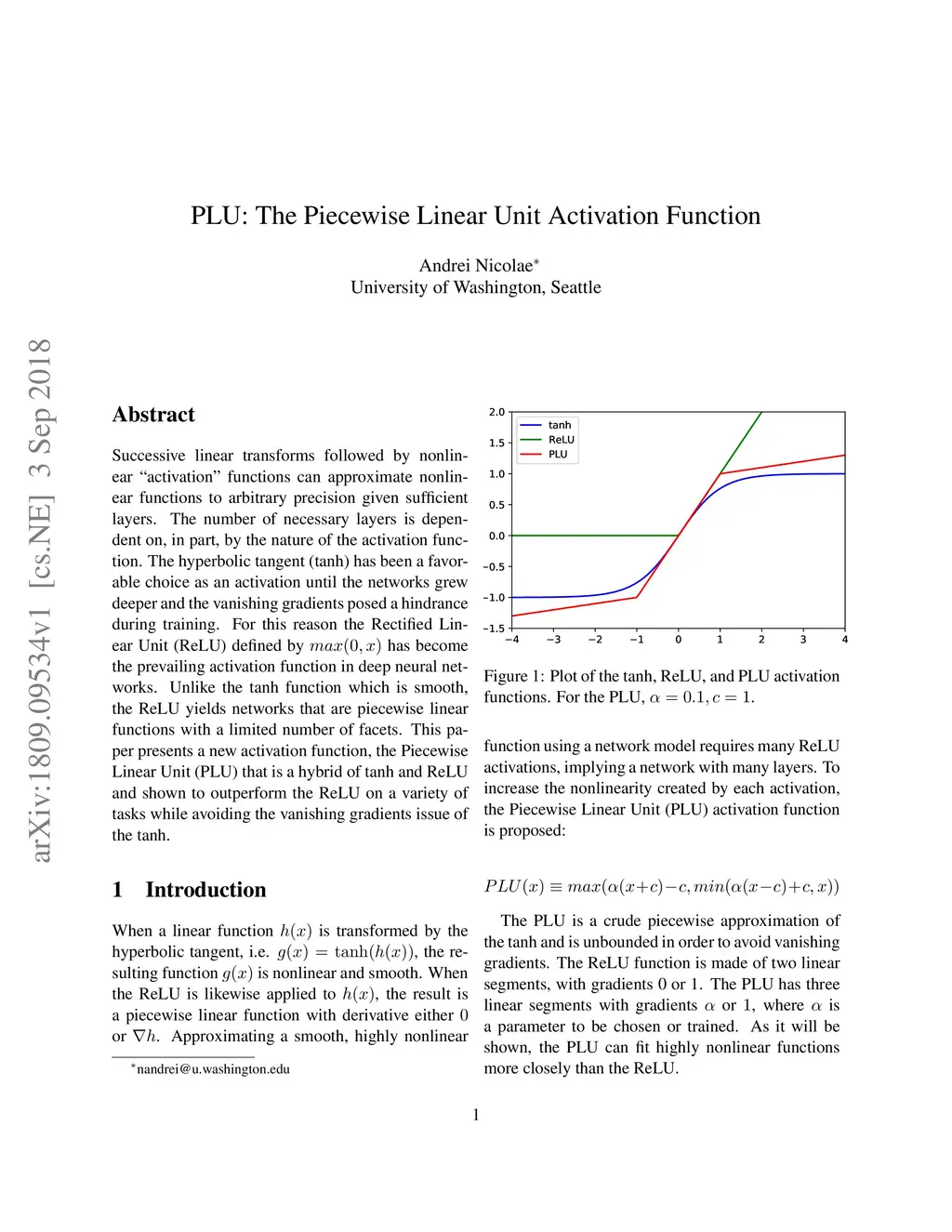 Successive linear transforms followed by nonlinear "activation" functions can approximate nonlinear functions to arbitrary precision given sufficient layers. The number of necessary layers is dependent on, in part, by the nature of the activation function. The hyperbolic tangent (tanh) has been a favorable choice as an activation until the networks grew deeper and the vanishing gradients posed a hindrance during training. For this reason the Rectified Linear Unit (ReLU) defined by max(0, x) has become the prevailing activation function in deep neural networks. Unlike the tanh function which is smooth, the ReLU yields networks that are piecewise linear functions with a limited number of facets. This paper presents a new activation function, the Piecewise Linear Unit (PLU) that is a hybrid of tanh and ReLU and shown to outperform the ReLU on a variety of tasks while avoiding the vanishing gradients issue of the tanh.