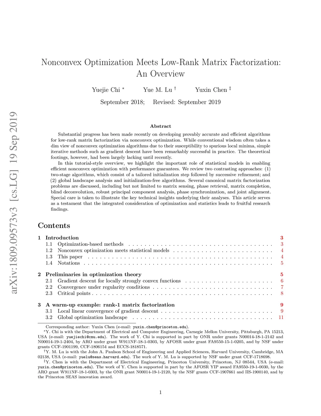 Substantial progress has been made recently on developing provably accurate and efficient algorithms for low-rank matrix factorization via nonconvex optimization. While conventional wisdom often takes a dim view of nonconvex optimization algorithms due to their susceptibility to spurious local minima, simple iterative methods such as gradient descent have been remarkably successful in practice. The theoretical footings, however, had been largely lacking until recently. In this tutorial-style overview, we highlight the important role of statistical models in enabling efficient nonconvex optimization with performance guarantees. We review two contrasting approaches: (1) two-stage algorithms, which consist of a tailored initialization step followed by successive refinement; and (2) global landscape analysis and initialization-free algorithms. Several canonical matrix factorization problems are discussed, including but not limited to matrix sensing, phase retrieval, matrix completion, blind deconvolution, robust principal component analysis, phase synchronization, and joint alignment. Special care is taken to illustrate the key technical insights underlying their analyses. This article serves as a testament that the integrated consideration of optimization and statistics leads to fruitful research findings.