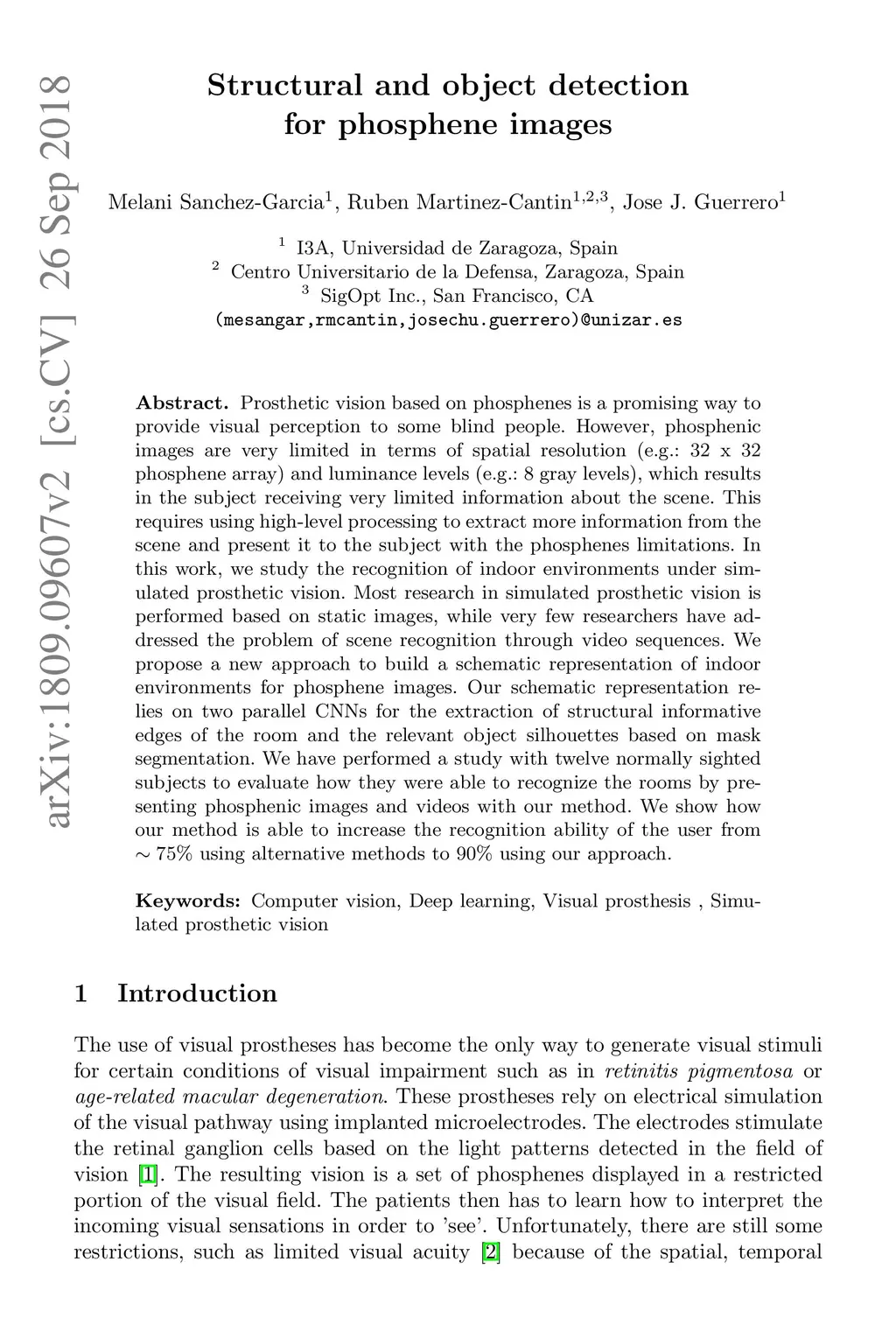 Prosthetic vision based on phosphenes is a promising way to provide visual perception to some blind people. However, phosphenic images are very limited in terms of spatial resolution (e.g.: 32 x 32 phosphene array) and luminance levels (e.g.: 8 gray levels), which results in the subject receiving very limited information about the scene. This requires using high-level processing to extract more information from the scene and present it to the subject with the phosphenes limitations. In this work, we study the recognition of indoor environments under simulated prosthetic vision. Most research in simulated prosthetic vision is performed based on static images, while very few researchers have addressed the problem of scene recognition through video sequences. We propose a new approach to build a schematic representation of indoor environments for phosphene images. Our schematic representation relies on two parallel CNNs for the extraction of structural informative edges of the room and the relevant object silhouettes based on mask segmentation. We have performed a study with twelve normally sighted subjects to evaluate how our methods were able to the room recognition by presenting phosphenic images and videos. We show how our method is able to increase the recognition ability of the user from 75% using alternative methods to 90% using our approach.