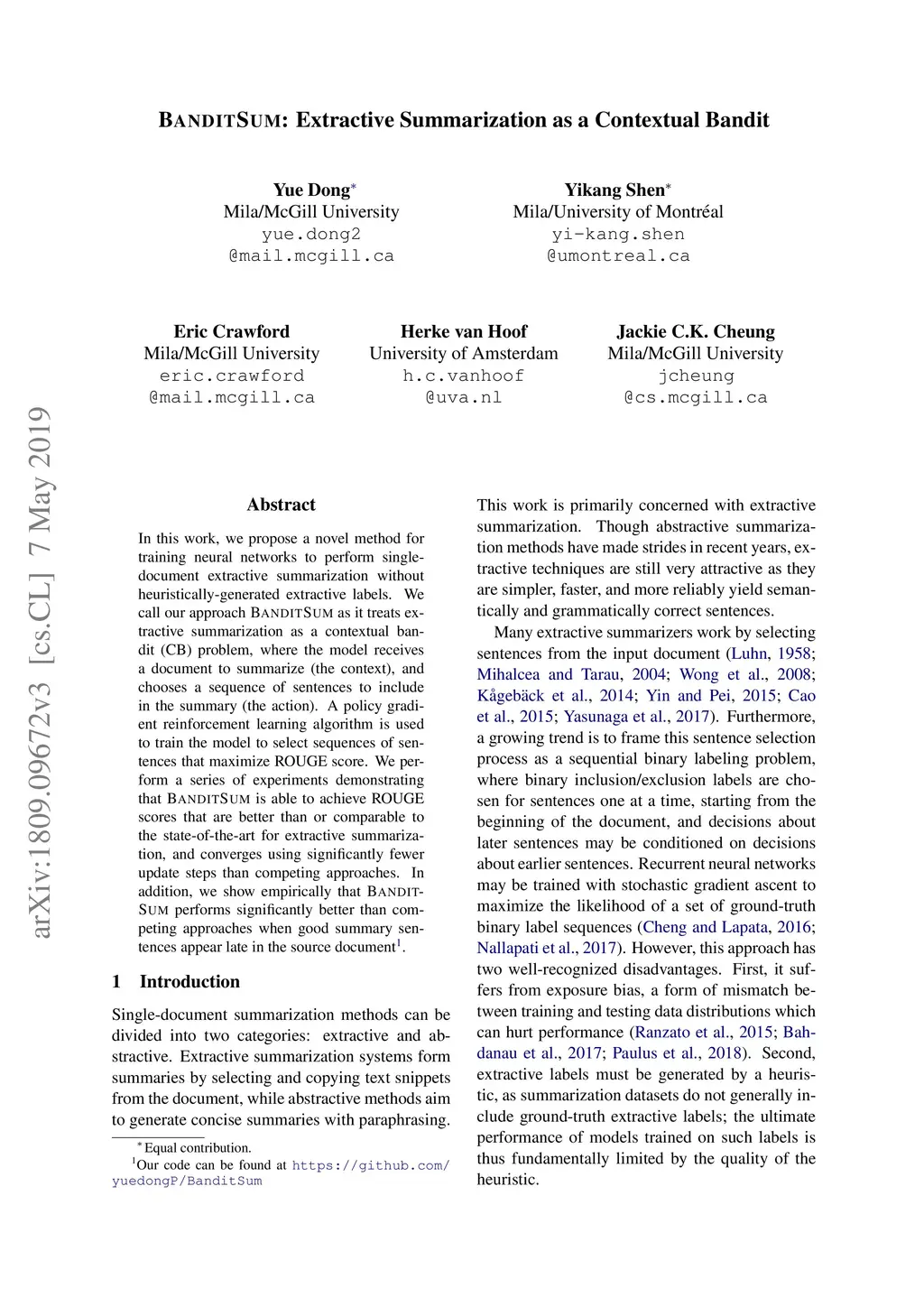 BanditSum: Extractive Summarization as a Contextual Bandit