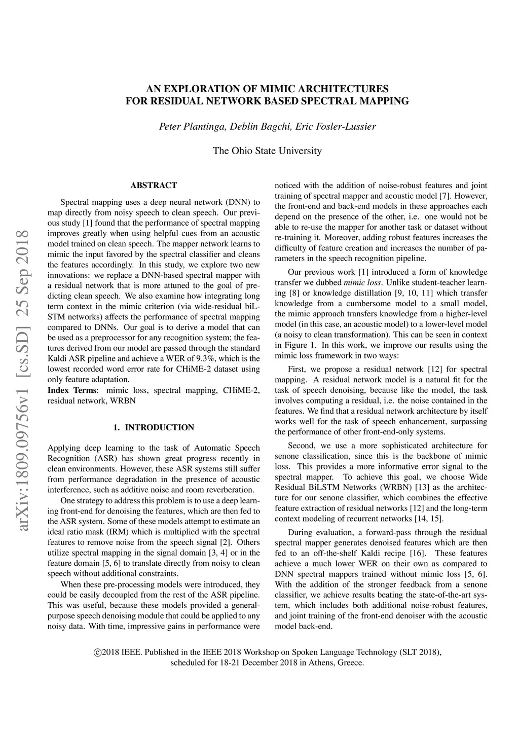 Spectral mapping uses a deep neural network (DNN) to map directly from noisy speech to clean speech. Our previous study found that the performance of spectral mapping improves greatly when using helpful cues from an acoustic model trained on clean speech. The mapper network learns to mimic the input favored by the spectral classifier and cleans the features accordingly. In this study, we explore two new innovations: we replace a DNN-based spectral mapper with a residual network that is more attuned to the goal of predicting clean speech. We also examine how integrating long term context in the mimic criterion (via wide-residual biLSTM networks) affects the performance of spectral mapping compared to DNNs. Our goal is to derive a model that can be used as a preprocessor for any recognition system; the features derived from our model are passed through the standard Kaldi ASR pipeline and achieve a WER of 9.3%, which is the lowest recorded word error rate for CHiME-2 dataset using only feature adaptation.