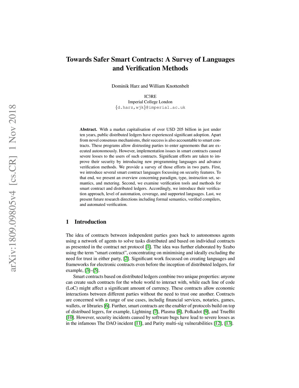 With a market capitalisation of over USD 205 billion in just under ten years, public distributed ledgers have experienced significant adoption. Apart from novel consensus mechanisms, their success is also accountable to smart contracts. These programs allow distrusting parties to enter agreements that are executed autonomously. However, implementation issues in smart contracts caused severe losses to the users of such contracts. Significant efforts are taken to improve their security by introducing new programming languages and advance verification methods. We provide a survey of those efforts in two parts. First, we introduce several smart contract languages focussing on security features. To that end, we present an overview concerning paradigm, type, instruction set, semantics, and metering. Second, we examine verification tools and methods for smart contract and distributed ledgers. Accordingly, we introduce their verification approach, level of automation, coverage, and supported languages. Last, we present future research directions including formal semantics, verified compilers, and automated verification.