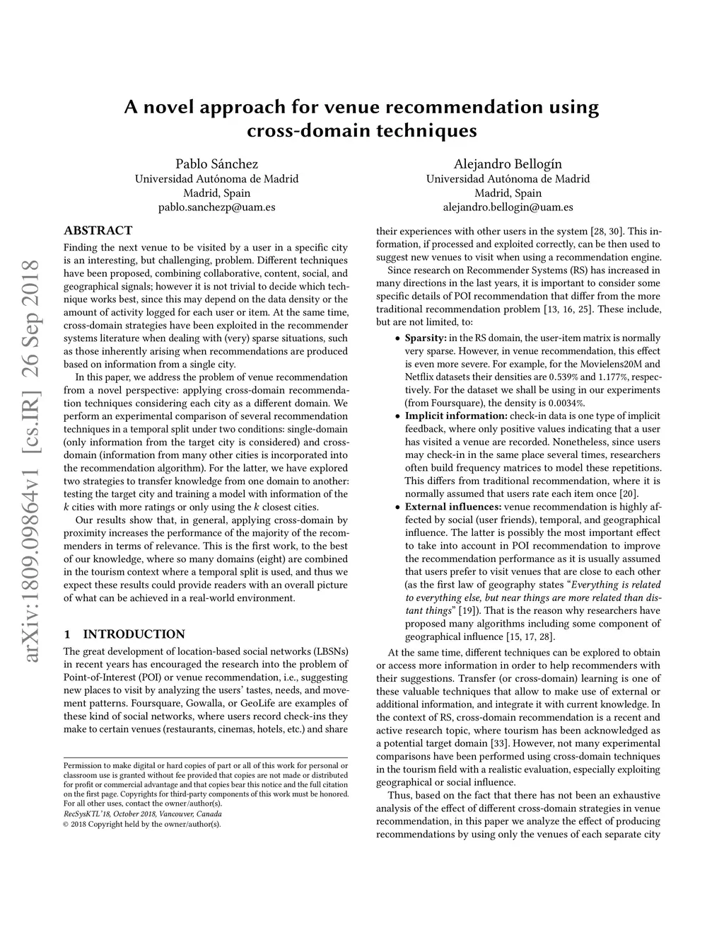 Finding the next venue to be visited by a user in a specific city is an interesting, but challenging, problem. Different techniques have been proposed, combining collaborative, content, social, and geographical signals; however it is not trivial to decide which tech- nique works best, since this may depend on the data density or the amount of activity logged for each user or item. At the same time, cross-domain strategies have been exploited in the recommender systems literature when dealing with (very) sparse situations, such as those inherently arising when recommendations are produced based on information from a single city. In this paper, we address the problem of venue recommendation from a novel perspective: applying cross-domain recommenda- tion techniques considering each city as a different domain. We perform an experimental comparison of several recommendation techniques in a temporal split under two conditions: single-domain (only information from the target city is considered) and cross- domain (information from many other cities is incorporated into the recommendation algorithm). For the latter, we have explored two strategies to transfer knowledge from one domain to another: testing the target city and training a model with information of the k cities with more ratings or only using the k closest cities. Our results show that, in general, applying cross-domain by proximity increases the performance of the majority of the recom- menders in terms of relevance. This is the first work, to the best of our knowledge, where so many domains (eight) are combined in the tourism context where a temporal split is used, and thus we expect these results could provide readers with an overall picture of what can be achieved in a real-world environment.