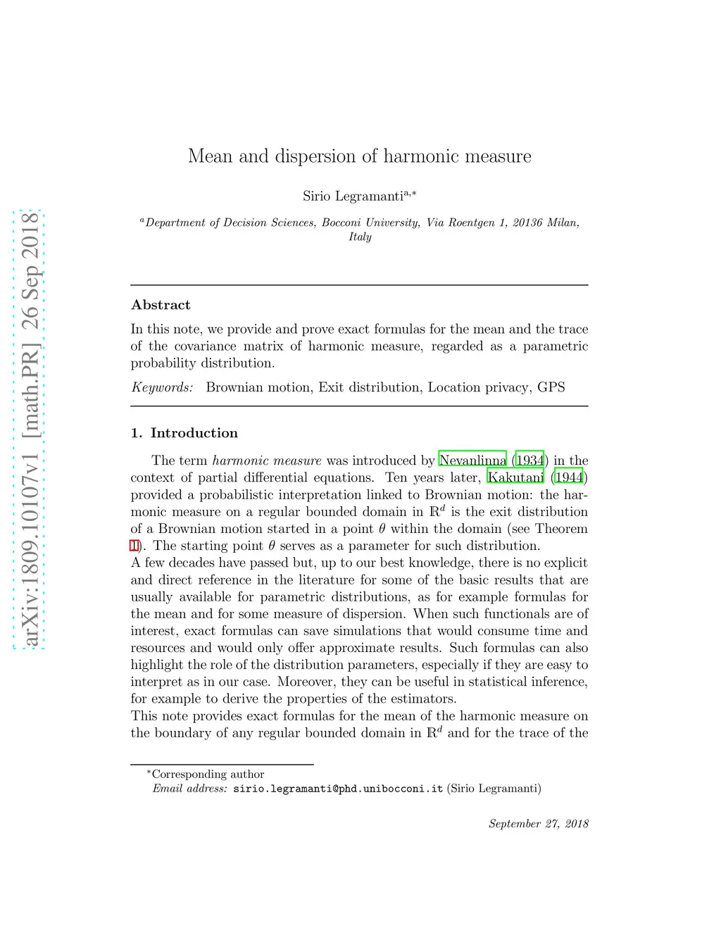 In this note, we provide and prove exact formulas for the mean and the trace of the covariance matrix of harmonic measure, regarded as a parametric probability distribution.