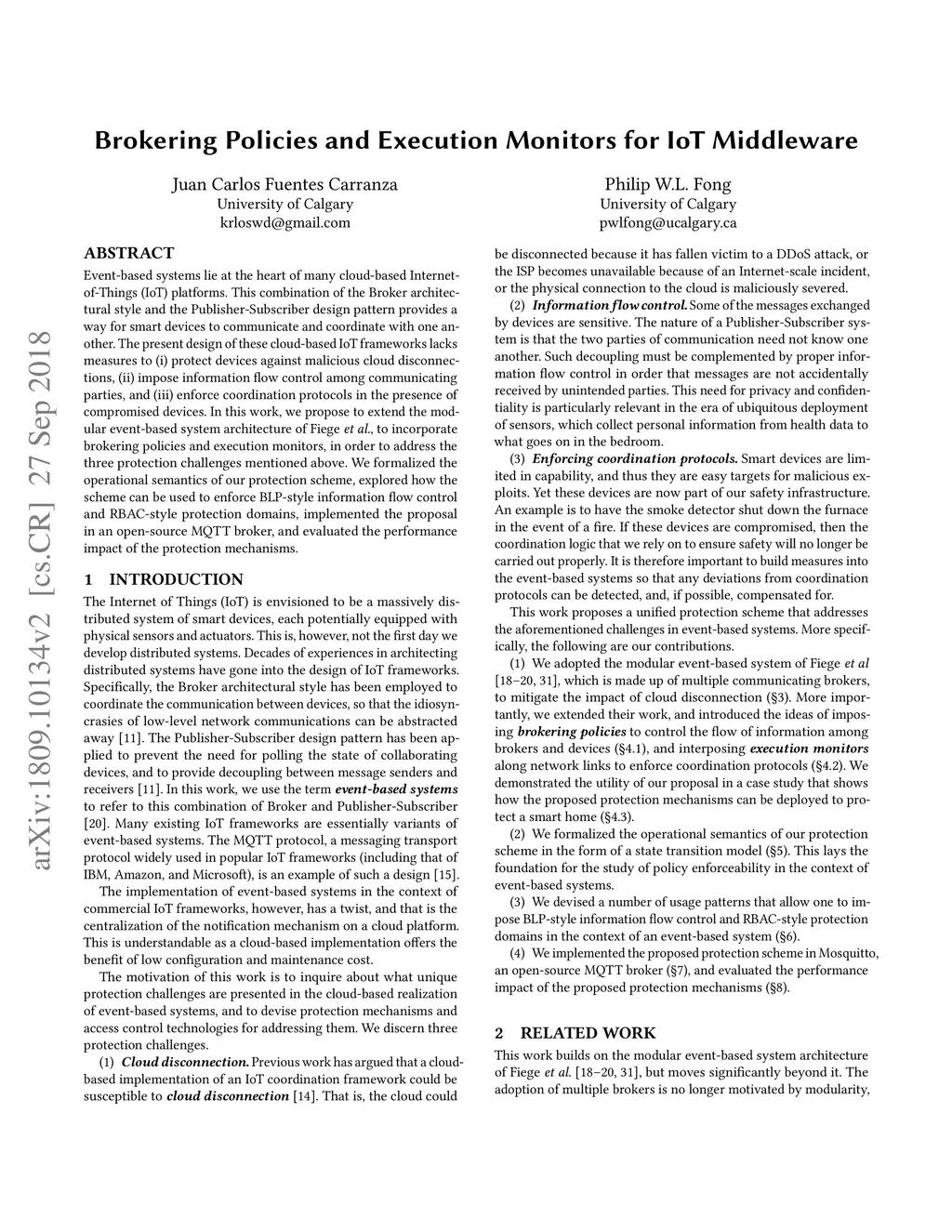 Event-based systems lie at the heart of many cloud-based Internet-of-Things (IoT) platforms. This combination of the Broker architectural style and the Publisher-Subscriber design pattern provides a way for smart devices to communicate and coordinate with one another. The present design of these cloud-based IoT frameworks lacks measures to (i) protect devices against malicious cloud disconnections, (ii) impose information flow control among communicating parties, and (iii) enforce coordination protocols in the presence of compromised devices. In this work, we propose to extend the modular event-based system architecture of Fiege et al., to incorporate brokering policies and execution monitors, in order to address the three protection challenges mentioned above. We formalized the operational semantics of our protection scheme, explored how the scheme can be used to enforce BLP-style information flow control and RBAC-style protection domains, implemented the proposal in an open-source MQTT broker, and evaluated the performance impact of the protection mechanisms.
