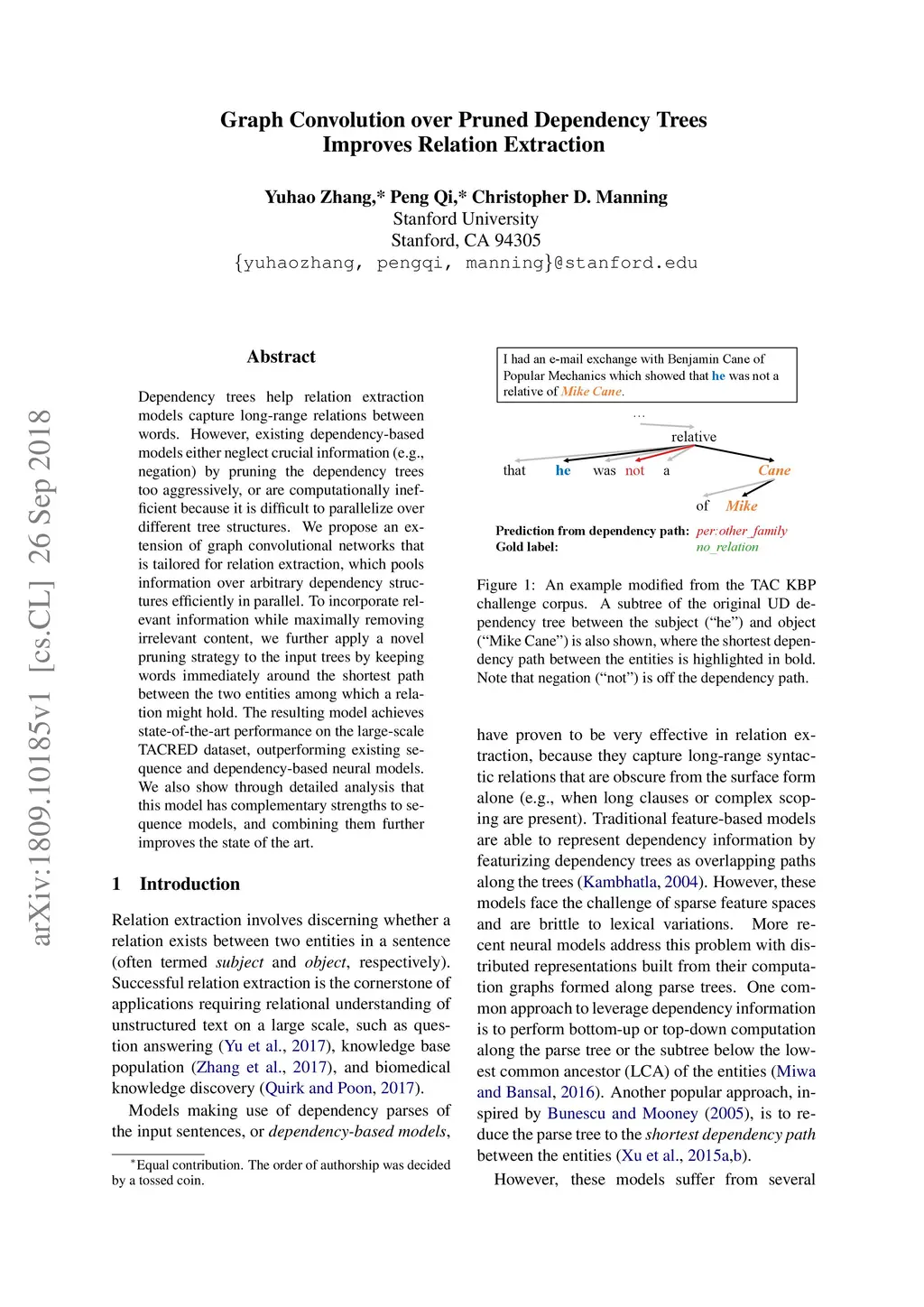Graph Convolution over Pruned Dependency Trees Improves Relation