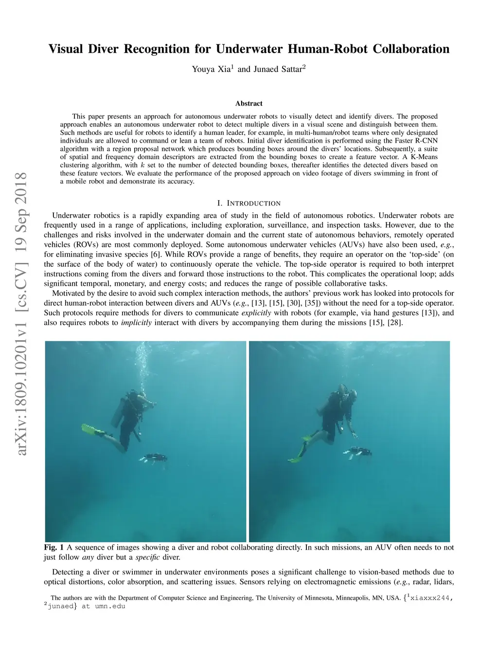 This paper presents an approach for autonomous underwater robots to visually detect and identify divers. The proposed approach enables an autonomous underwater robot to detect multiple divers in a visual scene and distinguish between them. Such methods are useful for robots to identify a human leader, for example, in multi-human/robot teams where only designated individuals are allowed to command or lean a team of robots. Initial diver identification is performed using the Faster R-CNN algorithm with a region proposal network which produces bounding boxes around the divers' locations. Subsequently, a suite of spatial and frequency domain descriptors are extracted from the bounding boxes to create a feature vector. A K-Means clustering algorithm, with k set to the number of detected bounding boxes, thereafter identifies the detected divers based on these feature vectors. We evaluate the performance of the proposed approach on video footage of divers swimming in front of a mobile robot and demonstrate its accuracy.