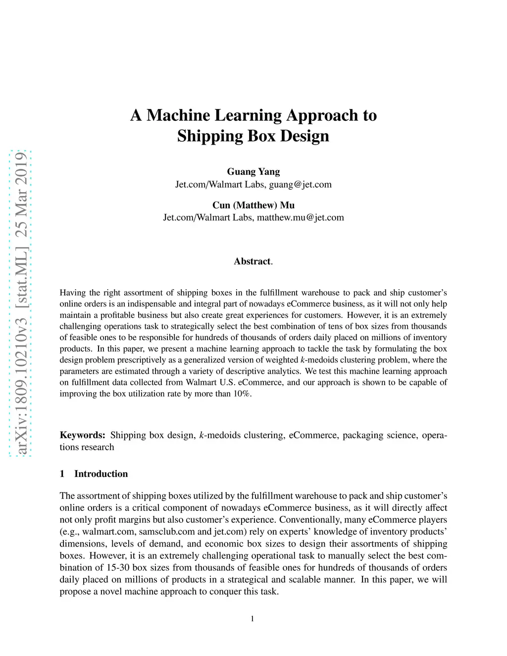 Having the right assortment of shipping boxes in the fulfillment warehouse to pack and ship customer's online orders is an indispensable and integral part of nowadays eCommerce business, as it will not only help maintain a profitable business but also create great experiences for customers. However, it is an extremely challenging operations task to strategically select the best combination of tens of box sizes from thousands of feasible ones to be responsible for hundreds of thousands of orders daily placed on millions of inventory products. In this paper, we present a machine learning approach to tackle the task by formulating the box design problem prescriptively as a generalized version of weighted -medoids clustering problem, where the parameters are estimated through a variety of descriptive analytics. We test this machine learning approach on fulfillment data collected from Walmart U.S. eCommerce, and our approach is shown to be capable of improving the box utilization rate by more than .