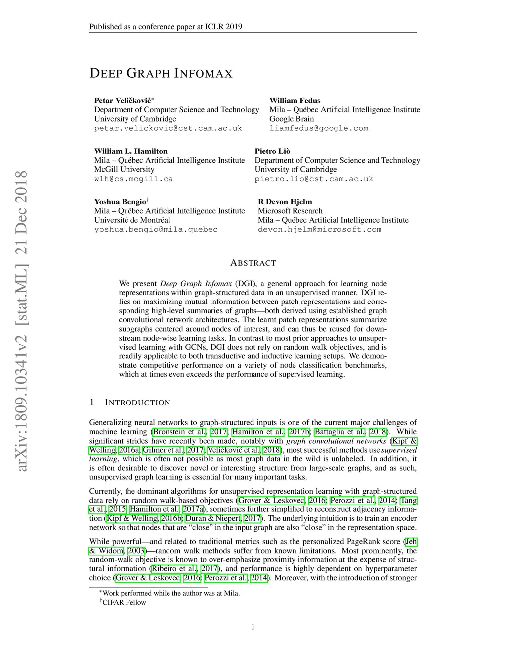 We present Deep Graph Infomax (DGI), a general approach for learning node representations within graph-structured data in an unsupervised manner. DGI relies on maximizing mutual information between patch representations and corresponding high-level summaries of graphs---both derived using established graph convolutional network architectures. The learnt patch representations summarize subgraphs centered around nodes of interest, and can thus be reused for downstream node-wise learning tasks. In contrast to most prior approaches to unsupervised learning with GCNs, DGI does not rely on random walk objectives, and is readily applicable to both transductive and inductive learning setups. We demonstrate competitive performance on a variety of node classification benchmarks, which at times even exceeds the performance of supervised learning.