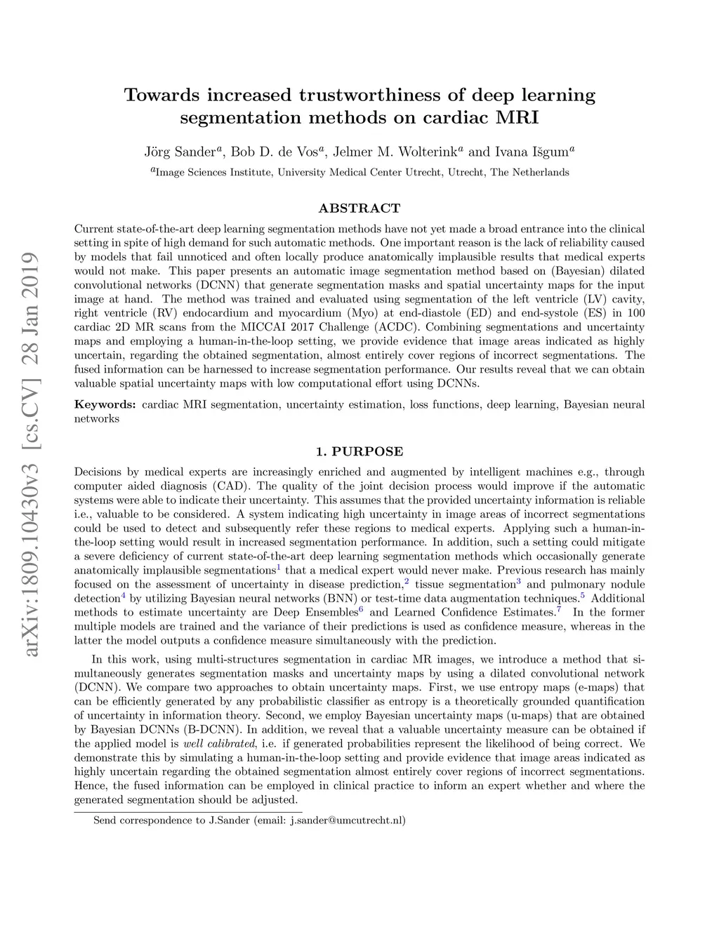 Current state-of-the-art deep learning segmentation methods have not yet made a broad entrance into the clinical setting in spite of high demand for such automatic methods. One important reason is the lack of reliability caused by models that fail unnoticed and often locally produce anatomically implausible results that medical experts would not make. This paper presents an automatic image segmentation method based on (Bayesian) dilated convolutional networks (DCNN) that generate segmentation masks and spatial uncertainty maps for the input image at hand. The method was trained and evaluated using segmentation of the left ventricle (LV) cavity, right ventricle (RV) endocardium and myocardium (Myo) at end-diastole (ED) and end-systole (ES) in 100 cardiac 2D MR scans from the MICCAI 2017 Challenge (ACDC). Combining segmentations and uncertainty maps and employing a human-in-the-loop setting, we provide evidence that image areas indicated as highly uncertain regarding the obtained segmentation almost entirely cover regions of incorrect segmentations. The fused information can be harnessed to increase segmentation performance. Our results reveal that we can obtain valuable spatial uncertainty maps with low computational effort using DCNNs.