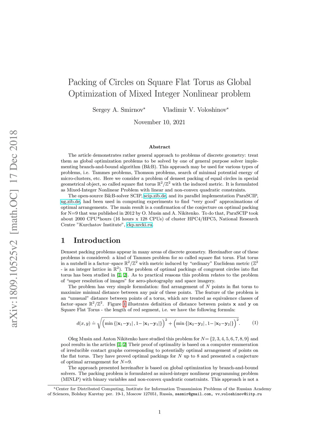The article demonstrates rather general approach to problems of discrete geometry: treat them as global optimization problems to be solved by one of general purpose solver implementing branch-and-bound algorithm (B&B). This approach may be used for various types of problems, i.e. Tammes problems, Thomson problems, search of minimal potential energy of micro-clusters, etc. Here we consider a problem of densest packing of equal circles in special geometrical object, so called square flat torus with the induced metric. It is formulated as Mixed-Integer Nonlinear Problem with linear and non-convex quadratic constraints. The open-source B&B-solver SCIP, http://scip.zib.de, and its parallel implementation ParaSCIP, http://ug.zib.de, had been used in computing experiments to find "very good" approximations of optimal arrangements. The main result is a confirmation of the conjecture on optimal packing for N=9 that was published in 2012 by O. Musin and A. Nikitenko. To do that, ParaSCIP took about 2000 CPU*hours (16 hours x 128 CPUs) of cluster HPC4/HPC5, National Research Centre "Kurchatov Institute", http://ckp.nrcki.ru