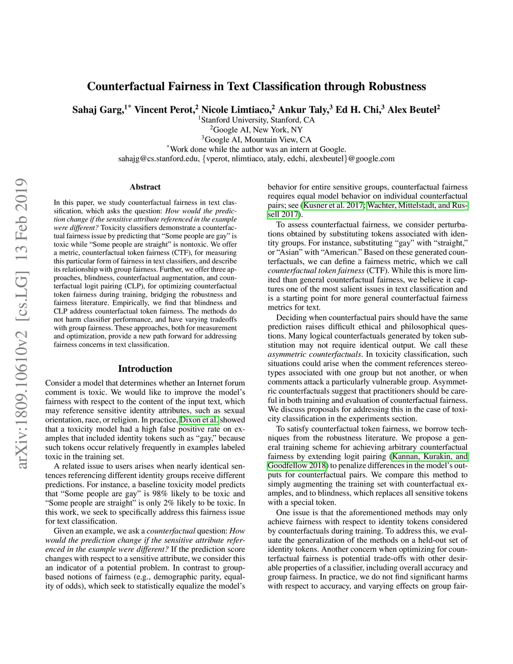 In this paper, we study counterfactual fairness in text classification, which asks the question: How would the prediction change if the sensitive attribute referenced in the example were different? Toxicity classifiers demonstrate a counterfactual fairness issue by predicting that "Some people are gay" is toxic while "Some people are straight" is nontoxic. We offer a metric, counterfactual token fairness (CTF), for measuring this particular form of fairness in text classifiers, and describe its relationship with group fairness. Further, we offer three approaches, blindness, counterfactual augmentation, and counterfactual logit pairing (CLP), for optimizing counterfactual token fairness during training, bridging the robustness and fairness literature. Empirically, we find that blindness and CLP address counterfactual token fairness. The methods do not harm classifier performance, and have varying tradeoffs with group fairness. These approaches, both for measurement and optimization, provide a new path forward for addressing fairness concerns in text classification.