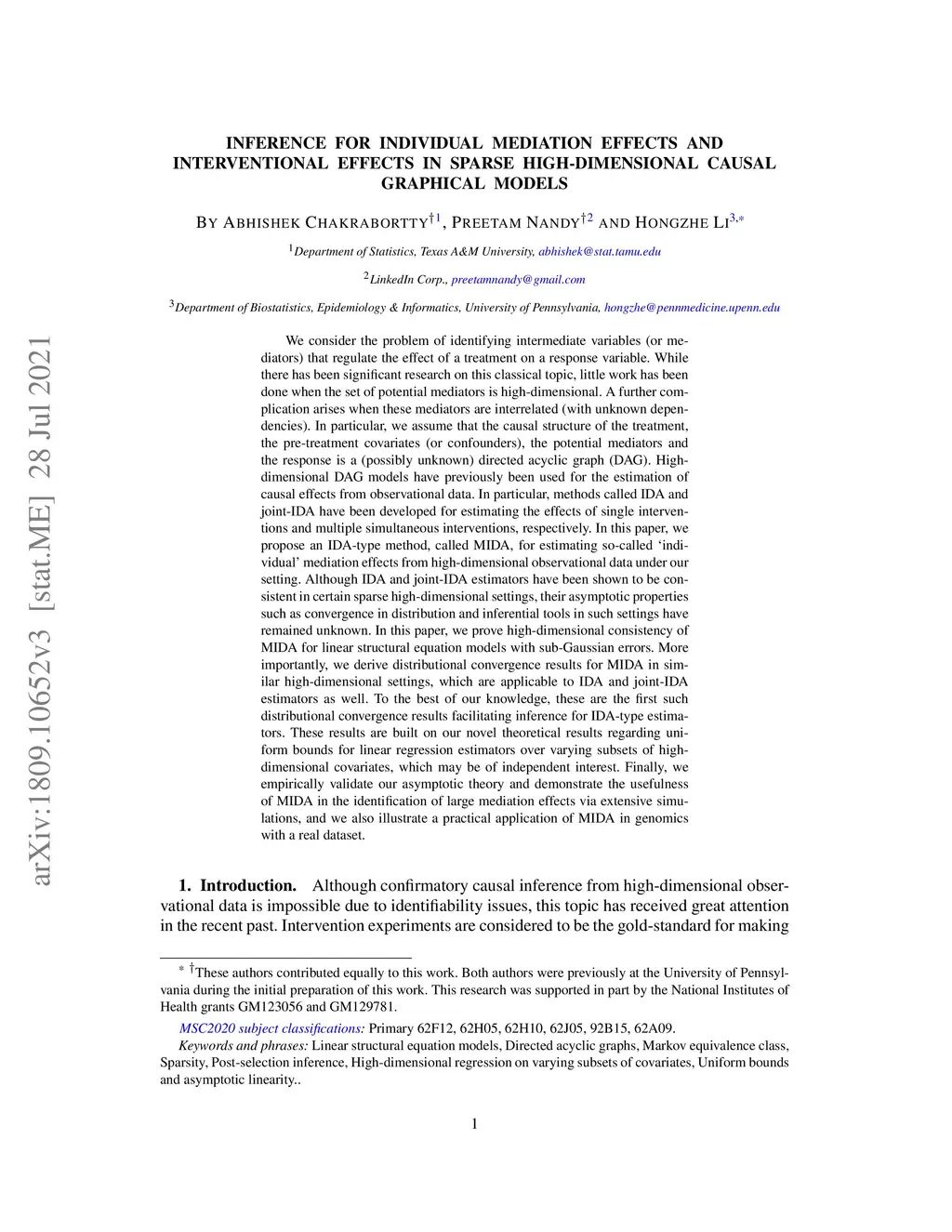 We consider the problem of identifying intermediate variables (or mediators) that regulate the effect of a treatment on a response variable. While there has been significant research on this classical topic, little work has been done when the set of potential mediators is high-dimensional (HD). A further complication arises when these mediators are interrelated (with unknown dependencies). In particular, we assume that the causal structure of the treatment, the confounders, the potential mediators and the response is a (possibly unknown) directed acyclic graph (DAG). HD DAG models have previously been used for the estimation of causal effects from observational data. In particular, methods called IDA and joint-IDA have been developed for estimating the effects of single and multiple simultaneous interventions, respectively. In this paper, we propose an IDA-type method called MIDA for estimating so-called individual mediation effects from HD observational data. Although IDA and joint-IDA estimators have been shown to be consistent in certain sparse HD settings, their asymptotic properties such as convergence in distribution and inferential tools in such settings have remained unknown. In this paper, we prove HD consistency of MIDA for linear structural equation models with sub-Gaussian errors. More importantly, we derive distributional convergence results for MIDA in similar HD settings, which are applicable to IDA and joint-IDA estimators as well. To our knowledge, these are the first such distributional convergence results facilitating inference for IDA-type estimators. These are built on our novel theoretical results regarding uniform bounds for linear regression estimators over varying subsets of HD covariates which may be of independent interest. Finally, we empirically validate our asymptotic theory for MIDA and demonstrate its usefulness via simulations and a real data application.