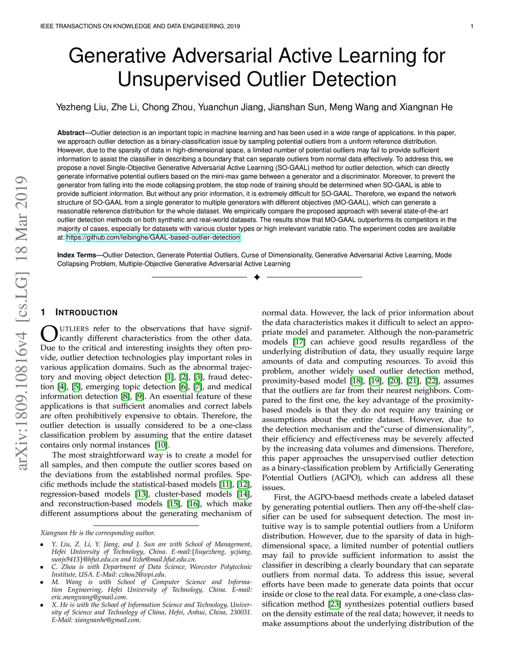 Outlier detection is an important topic in machine learning and has been used in a wide range of applications. In this paper, we approach outlier detection as a binary-classification issue by sampling potential outliers from a uniform reference distribution. However, due to the sparsity of data in high-dimensional space, a limited number of potential outliers may fail to provide sufficient information to assist the classifier in describing a boundary that can separate outliers from normal data effectively. To address this, we propose a novel Single-Objective Generative Adversarial Active Learning (SO-GAAL) method for outlier detection, which can directly generate informative potential outliers based on the mini-max game between a generator and a discriminator. Moreover, to prevent the generator from falling into the mode collapsing problem, the stop node of training should be determined when SO-GAAL is able to provide sufficient information. But without any prior information, it is extremely difficult for SO-GAAL. Therefore, we expand the network structure of SO-GAAL from a single generator to multiple generators with different objectives (MO-GAAL), which can generate a reasonable reference distribution for the whole dataset. We empirically compare the proposed approach with several state-of-the-art outlier detection methods on both synthetic and real-world datasets. The results show that MO-GAAL outperforms its competitors in the majority of cases, especially for datasets with various cluster types or high irrelevant variable ratio.