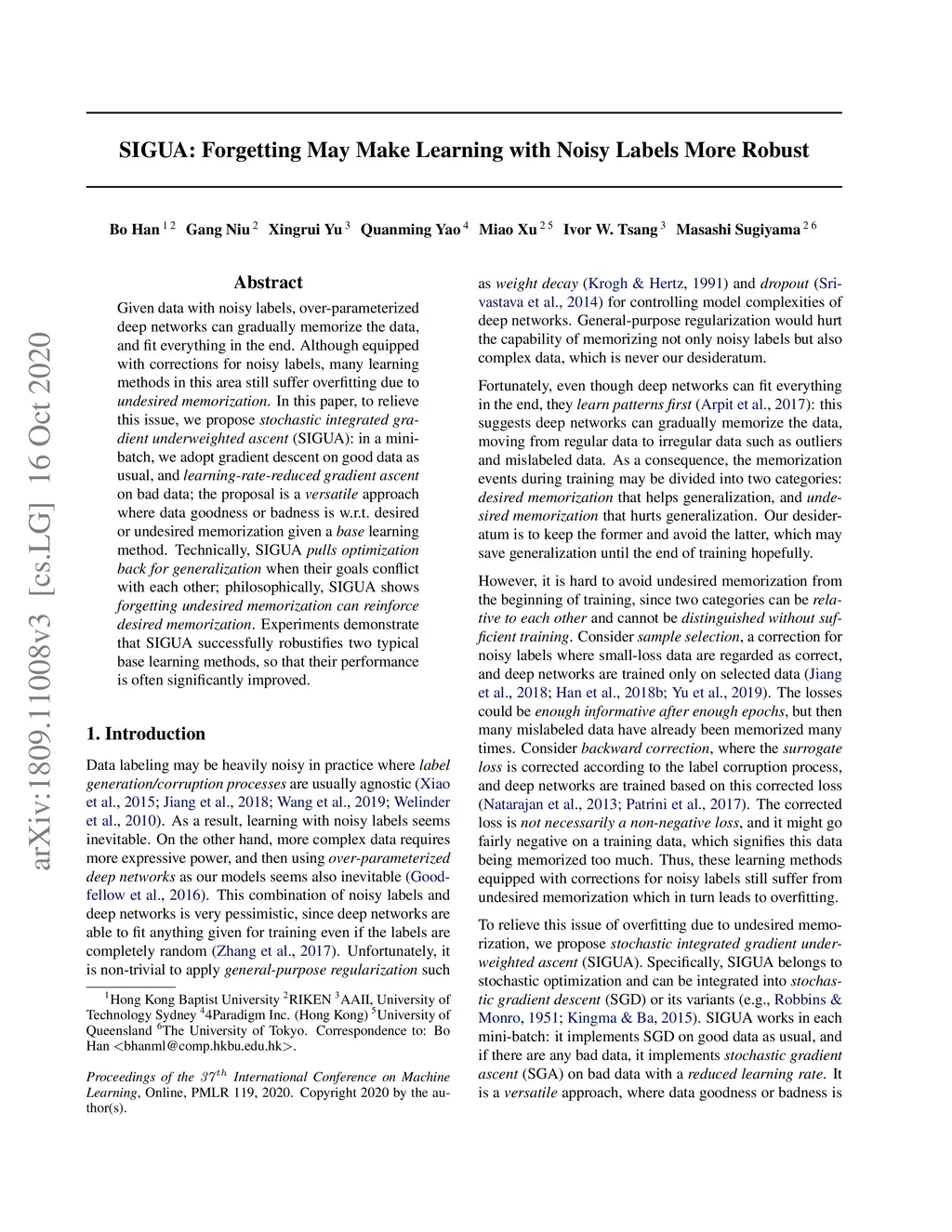 Given data with noisy labels, over-parameterized deep networks can gradually memorize the data, and fit everything in the end. Although equipped with corrections for noisy labels, many learning methods in this area still suffer overfitting due to undesired memorization. In this paper, to relieve this issue, we propose stochastic integrated gradient underweighted ascent (SIGUA): in a mini-batch, we adopt gradient descent on good data as usual, and learning-rate-reduced gradient ascent on bad data; the proposal is a versatile approach where data goodness or badness is w.r.t. desired or undesired memorization given a base learning method. Technically, SIGUA pulls optimization back for generalization when their goals conflict with each other; philosophically, SIGUA shows forgetting undesired memorization can reinforce desired memorization. Experiments demonstrate that SIGUA successfully robustifies two typical base learning methods, so that their performance is often significantly improved.
