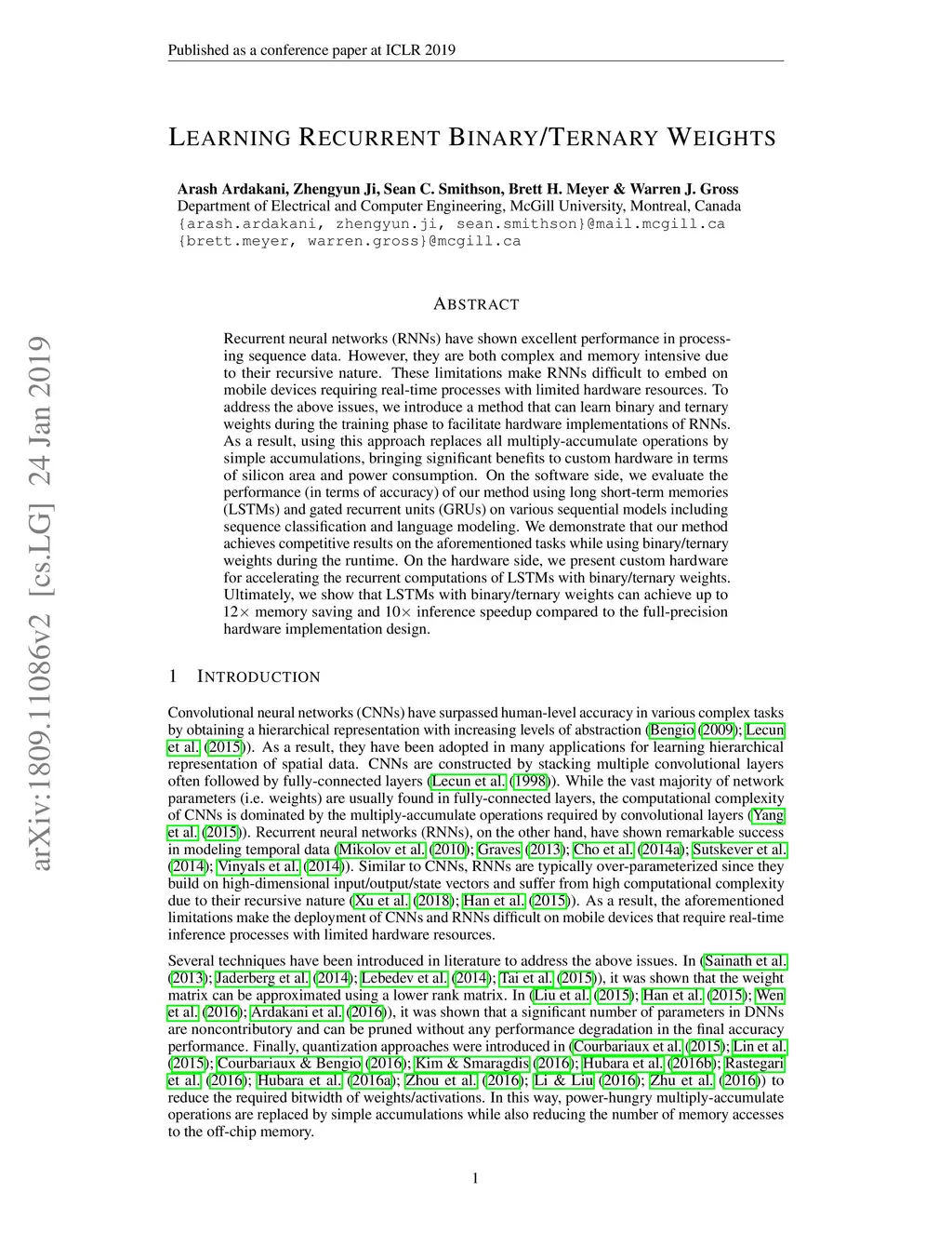 Learning Recurrent Binary/Ternary Weights