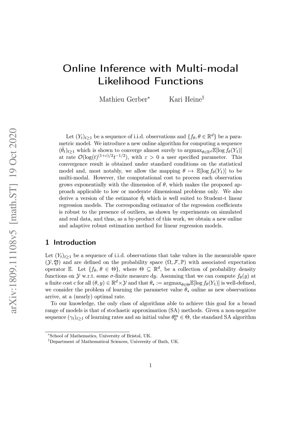 Let be a sequence of i.i.d.\ observations and be a parametric model. We introduce a new online algorithm for computing a sequence which is shown to converge almost surely to at rate $ \mathcal{O}(\log (t)^{(1+\varepsilon)/2}t^{-1/2})$, with a user specified parameter. This convergence result is obtained under standard conditions on the statistical model and, most notably, we allow the mapping to be multi-modal. However, the computational cost to process each observation grows exponentially with the dimension of , which makes the proposed approach applicable to low or moderate dimensional problems only. We also derive a version of the estimator which is well suited to Student-t linear regression models. The corresponding estimator of the regression coefficients is robust to the presence of outliers, as shown by experiments on simulated and real data, and thus, as a by-product of this work, we obtain a new online and adaptive robust estimation method for linear regression models.