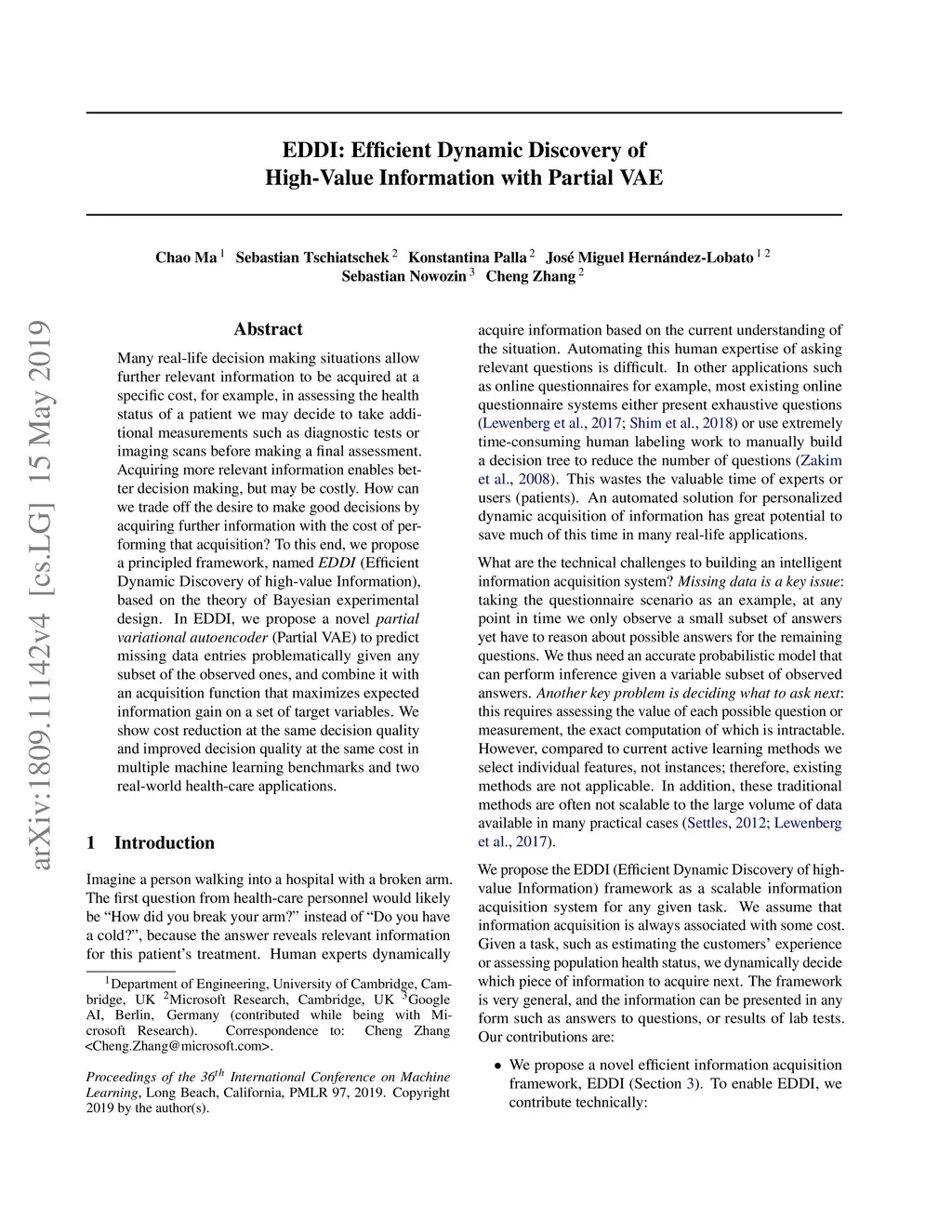 Many real-life decision-making situations allow further relevant information to be acquired at a specific cost, for example, in assessing the health status of a patient we may decide to take additional measurements such as diagnostic tests or imaging scans before making a final assessment. Acquiring more relevant information enables better decision making, but may be costly. How can we trade off the desire to make good decisions by acquiring further information with the cost of performing that acquisition? To this end, we propose a principled framework, named EDDI (Efficient Dynamic Discovery of high-value Information), based on the theory of Bayesian experimental design. In EDDI, we propose a novel partial variational autoencoder (Partial VAE) to predict missing data entries problematically given any subset of the observed ones, and combine it with an acquisition function that maximizes expected information gain on a set of target variables. We show cost reduction at the same decision quality and improved decision quality at the same cost in multiple machine learning benchmarks and two real-world health-care applications.