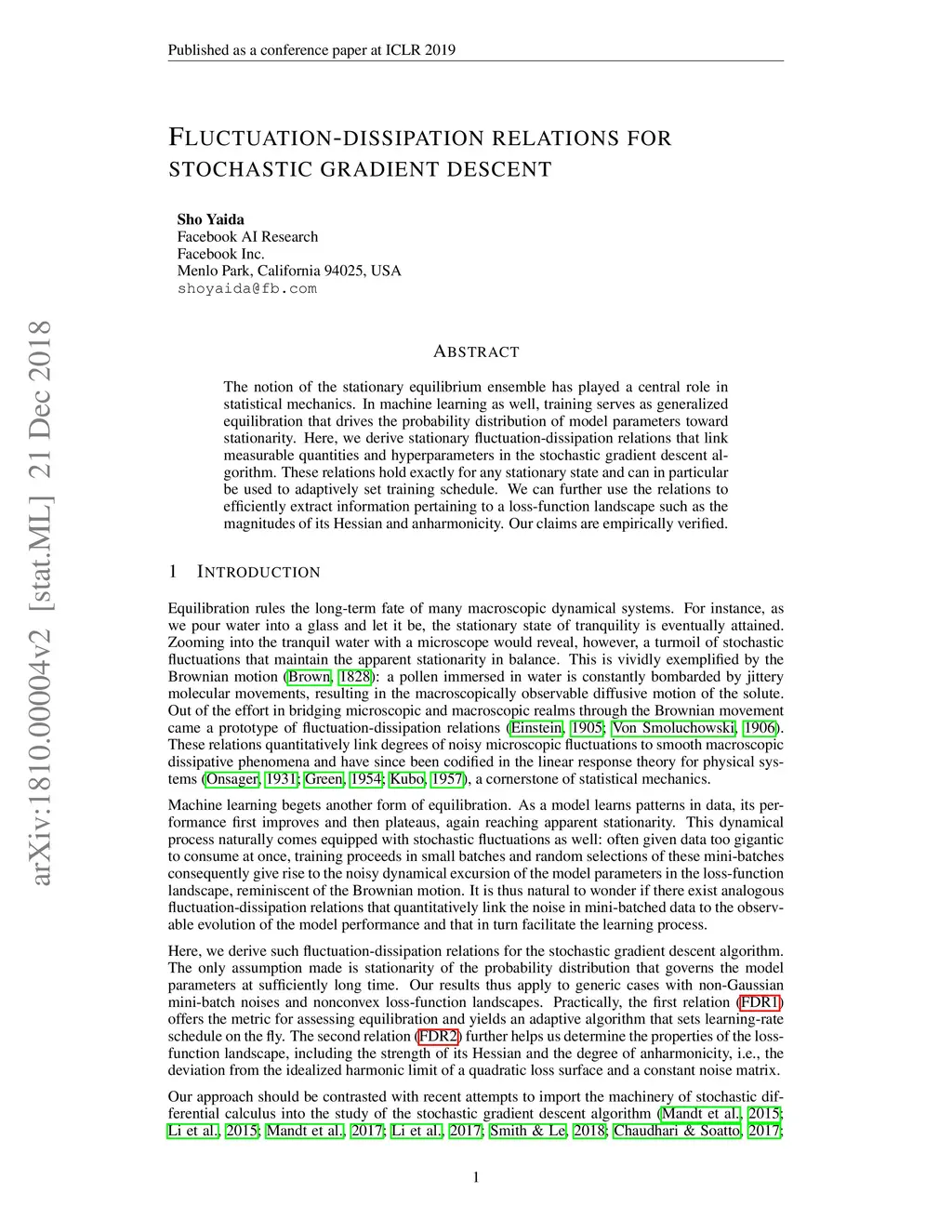 The notion of the stationary equilibrium ensemble has played a central role in statistical mechanics. In machine learning as well, training serves as generalized equilibration that drives the probability distribution of model parameters toward stationarity. Here, we derive stationary fluctuation-dissipation relations that link measurable quantities and hyperparameters in the stochastic gradient descent algorithm. These relations hold exactly for any stationary state and can in particular be used to adaptively set training schedule. We can further use the relations to efficiently extract information pertaining to a loss-function landscape such as the magnitudes of its Hessian and anharmonicity. Our claims are empirically verified.