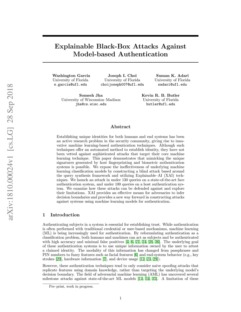 Establishing unique identities for both humans and end systems has been an active research problem in the security community, giving rise to innovative machine learning-based authentication techniques. Although such techniques offer an automated method to establish identity, they have not been vetted against sophisticated attacks that target their core machine learning technique. This paper demonstrates that mimicking the unique signatures generated by host fingerprinting and biometric authentication systems is possible. We expose the ineffectiveness of underlying machine learning classification models by constructing a blind attack based around the query synthesis framework and utilizing Explainable-AI (XAI) techniques. We launch an attack in under 130 queries on a state-of-the-art face authentication system, and under 100 queries on a host authentication system. We examine how these attacks can be defended against and explore their limitations. XAI provides an effective means for adversaries to infer decision boundaries and provides a new way forward in constructing attacks against systems using machine learning models for authentication.