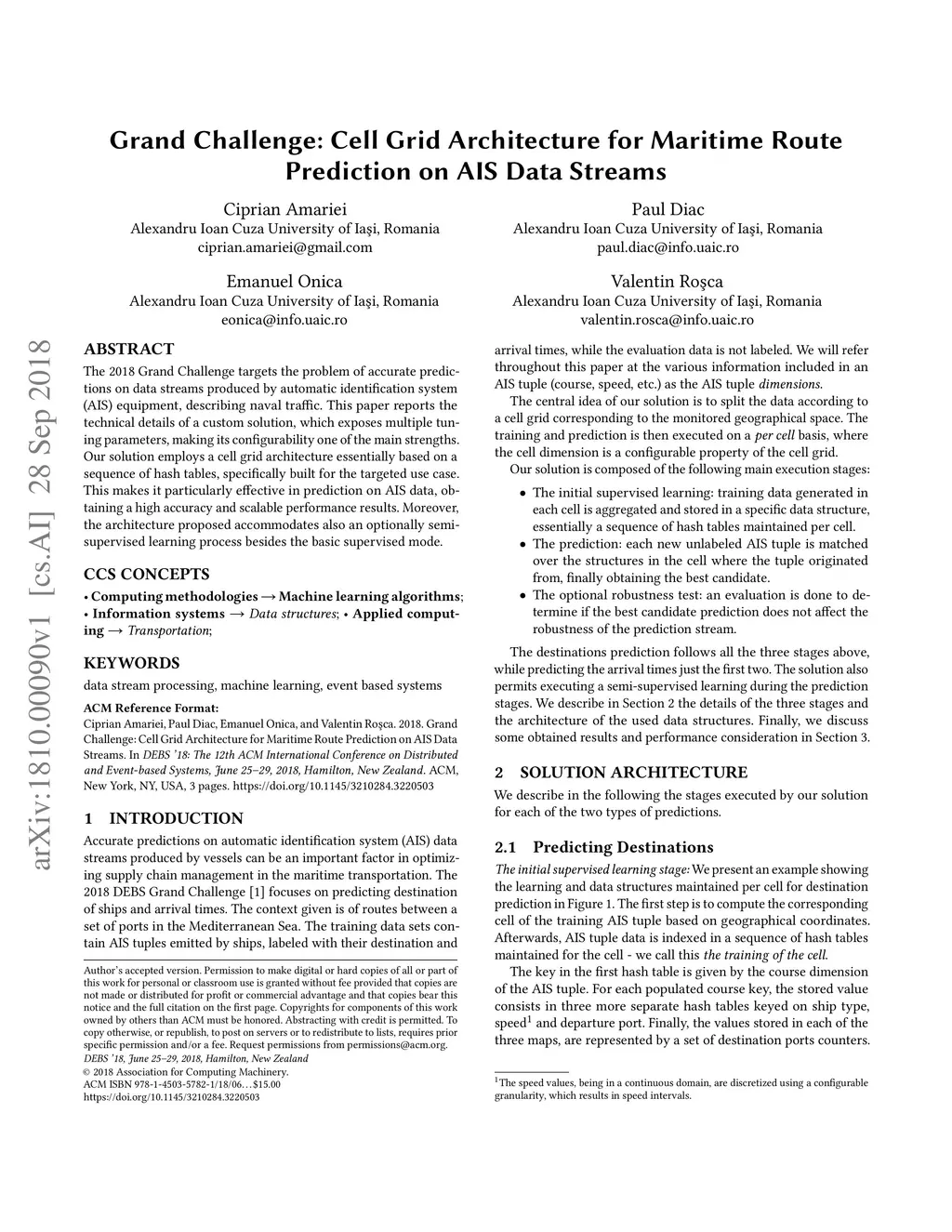 The 2018 Grand Challenge targets the problem of accurate predictions on data streams produced by automatic identification system (AIS) equipment, describing naval traffic. This paper reports the technical details of a custom solution, which exposes multiple tuning parameters, making its configurability one of the main strengths. Our solution employs a cell grid architecture essentially based on a sequence of hash tables, specifically built for the targeted use case. This makes it particularly effective in prediction on AIS data, obtaining a high accuracy and scalable performance results. Moreover, the architecture proposed accommodates also an optionally semi-supervised learning process besides the basic supervised mode.