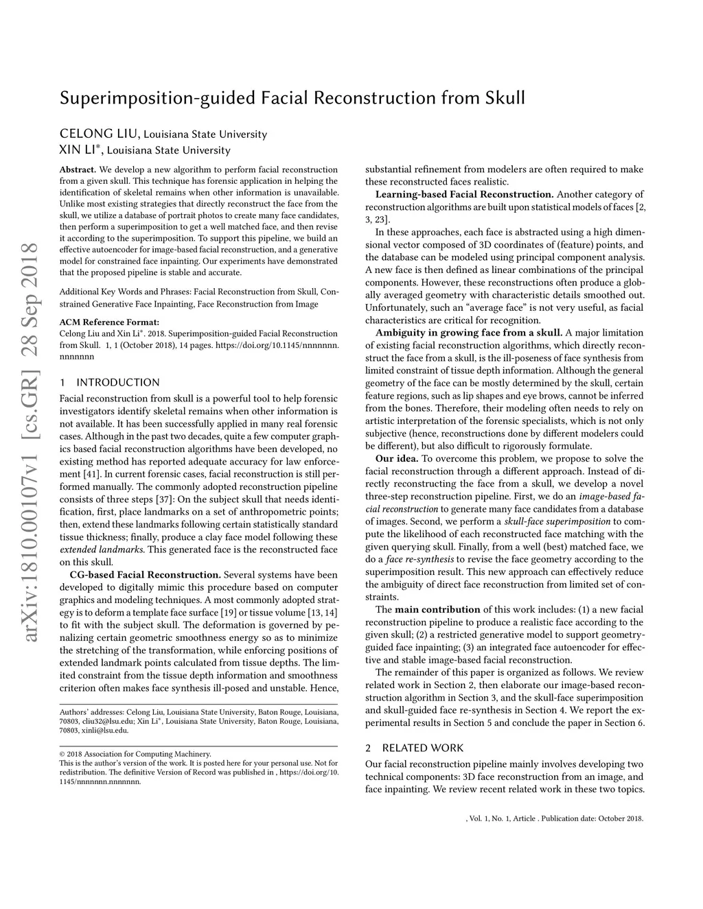 We develop a new algorithm to perform facial reconstruction from a given skull. This technique has forensic application in helping the identification of skeletal remains when other information is unavailable. Unlike most existing strategies that directly reconstruct the face from the skull, we utilize a database of portrait photos to create many face candidates, then perform a superimposition to get a well matched face, and then revise it according to the superimposition. To support this pipeline, we build an effective autoencoder for image-based facial reconstruction, and a generative model for constrained face inpainting. Our experiments have demonstrated that the proposed pipeline is stable and accurate.