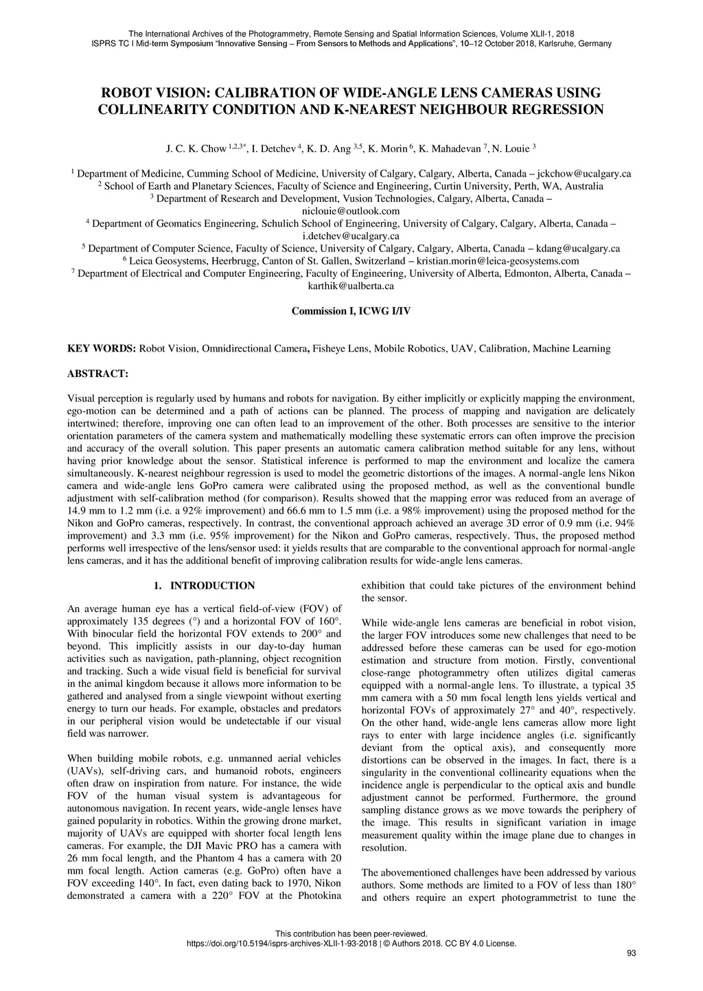 Robot Vision: Calibration of Wide-Angle Lens Cameras Using Collinearity